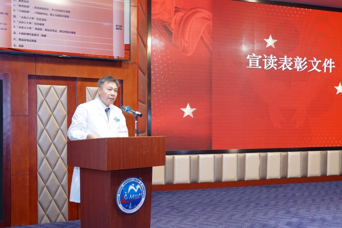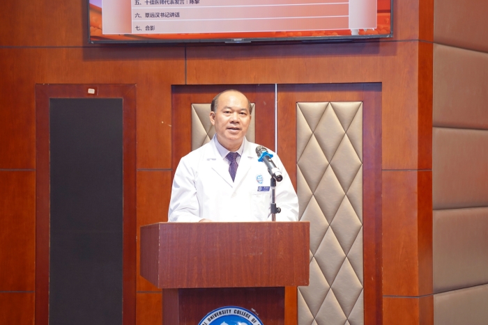 院党委书记覃远汉代表医院党政班子向全院医师致以节日问候和美好祝愿,向受到表彰的优秀医师表示热烈的祝贺。他指出,今年医师节的主题是“崇尚人文精神,彰显医者仁心”,这既是对医学本质的深刻诠释,也是对医者使命的崇高召唤。全院医师要深入学习贯彻党的二十大及二十届三中全会精神,践行“人民至上、生命至上”的理念,将医学人文关怀融入医务工作中,真正做到“用精湛的医术解除患者病痛,以医者仁心抚慰患者心灵”。他强调,2024年是新中国成立75周年,是学校90周年校庆之年,也是医院实现“十四五”规划目标攻坚克难的关键一年,他希望全院医师一要深化人文关怀,提升服务质量,用心、用情为人民群众的生命安全和身体健康服务,当好守护人民健康的忠诚卫士;二要持续学习创新,勇攀医学高峰,在追求医疗技术卓越性的同时,注重科学与人文的深度融合,为患者提供更加安全、有效、人性化的医疗服务;三要勇担健康使命,以更加昂扬的奋斗姿态,瞄准建设国际区域性优势的高水平口腔医院的既定目标,继续发扬口院人“敢闯、敢创、敢干”的精神,共同谱写医院新时代高质量发展的新篇章!