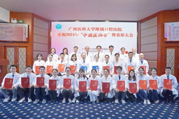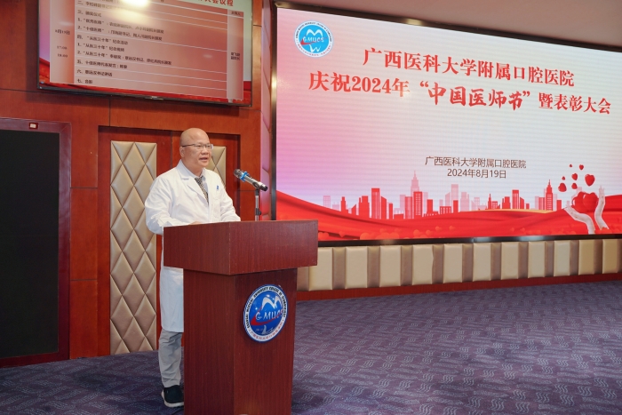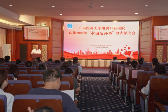 2024年8月19日下午,广西医科大学附属口腔医院在住院楼九楼学术报告厅召开庆祝2024年中国医师节暨表彰大会。全体在家院领导出席大会,全院中层干部、医师代表参加。大会由副院长梁飞新主持。