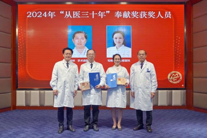 院领导向沈浩林医生、毛艳医生颁发“从医三十年”奉献奖