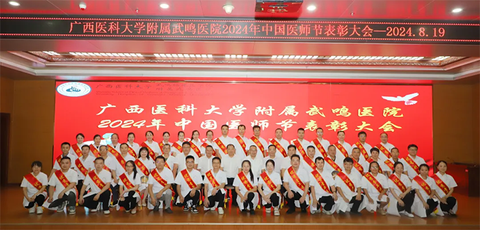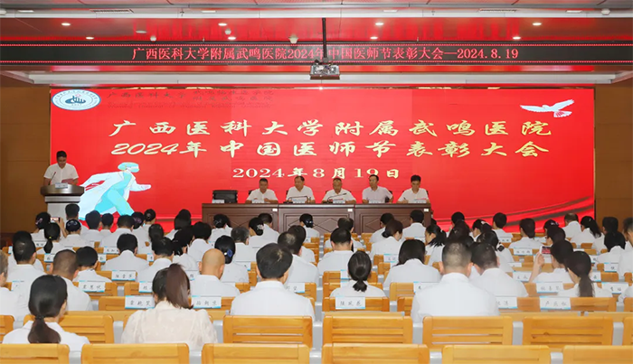 为弘扬医务工作者的崇高精神、发挥先进典型示范引领作用,激励全院医务人员担当奋进,8月19日下午,附属武鸣医院在1号楼21楼学术厅举行2024年“中国医师节”表彰大会。医院领导、全体中层干部、从医35年荣誉医师、获奖医师以及全院医师近400余人参加会议。会议由医院副院长赵伟主持。