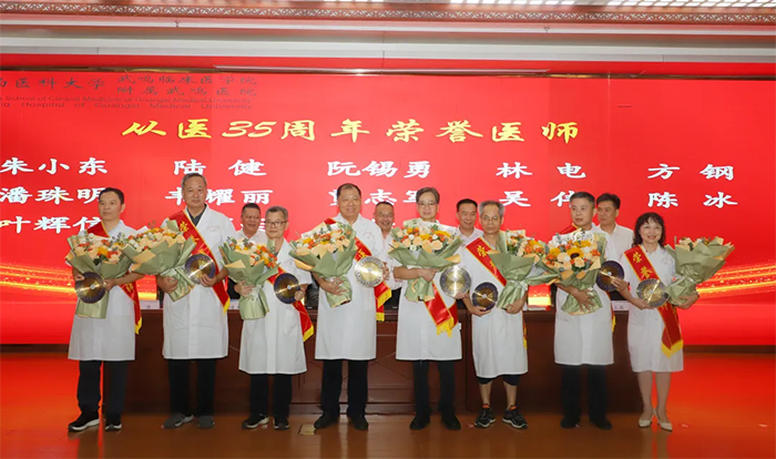 “从医35周年荣誉医师”代表李德全回顾了自己在医学道路上的坚持与奉献,深刻阐述了医者仁心的真谛,激励着在场的每一位年轻医师不忘初心,勇往直前,在医学的征途中不断砥砺前行;优秀科主任代表黄海、优秀医师代表梁海莹、优秀青年医师代表莫柒艳进行了发言,他们表达了对老专家们的敬仰和感激,并表示将向老前辈学习,以更加饱满的工作热情、更加精湛的医疗技术,全心全意为患者服务,为守护人民健康贡献自己的力量。