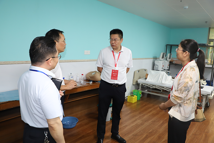 在走访临床技能培训中心和教研室时,唐卫中一行详细了解教学场所、教学设施配置和使用等情况,认真听取了学院开学教学工作准备情况汇报,并对现场检查情况提出指导意见。