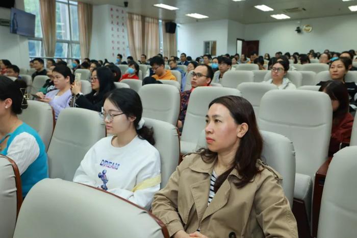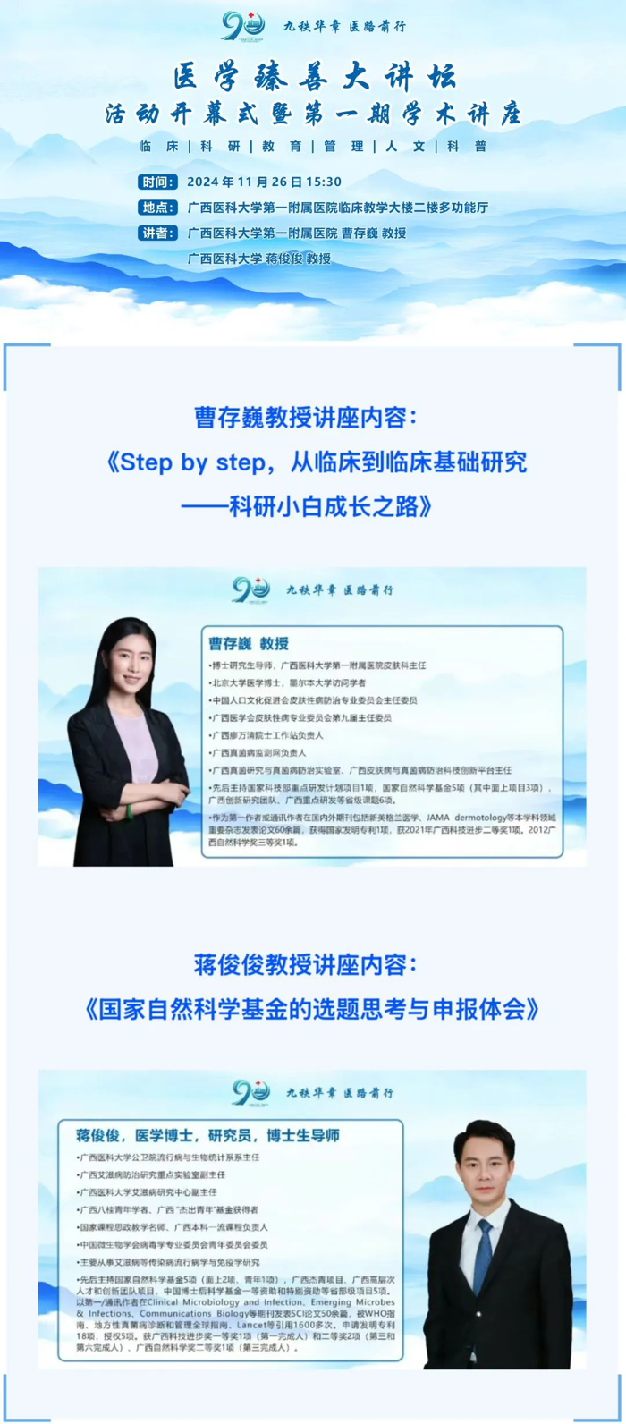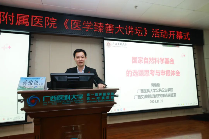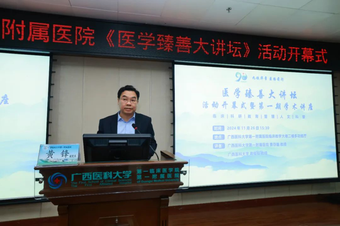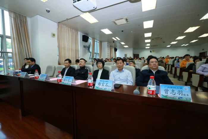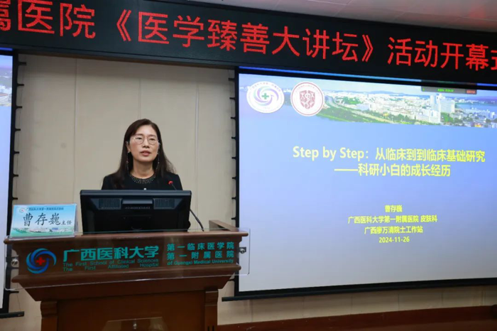 我校校长曾志羽,一附院党委书记李浪、院长郑宝石出席并致辞,广西廖万清院士工作站、一附院皮肤性病科负责人曹存巍教授和学校公共卫生学院副院长蒋俊俊研究员应邀莅临开讲,全体在院院领导、科研部、师生员工、进修生、住院医师规范化培训学员、研究生300多人参加,副院长黄锋主持。
