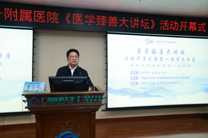 曾志羽在开幕致辞中对“医学臻善大讲坛”的启幕表示祝贺。他强调,在建校建院90周年之际开办大讲坛具有承前启后的历史意义。90年来,一附院与学校风雨同舟,携手提升广西医教研水平,积极配合学校推进“双一流”“省部共建”,为医疗改革和健康中国、健康广西建设提供了有力的人才支撑。他表示,“医学臻善大讲坛”与校庆“名家讲坛”“院士论坛”一脉相承,既是学术盛宴更是创新平台,相信通过专家们的真知灼见,必将为学校新医科建设、“双一流”发展注入新动能,为医教研事业增添新活力。希望一附院以此为契机,强化医教研协同,完善科教激励机制,提升讲坛普及率、参与度和覆盖面,激发科研创新热情,推动前沿科技与临床实践深度融合,更好服务人民健康。
