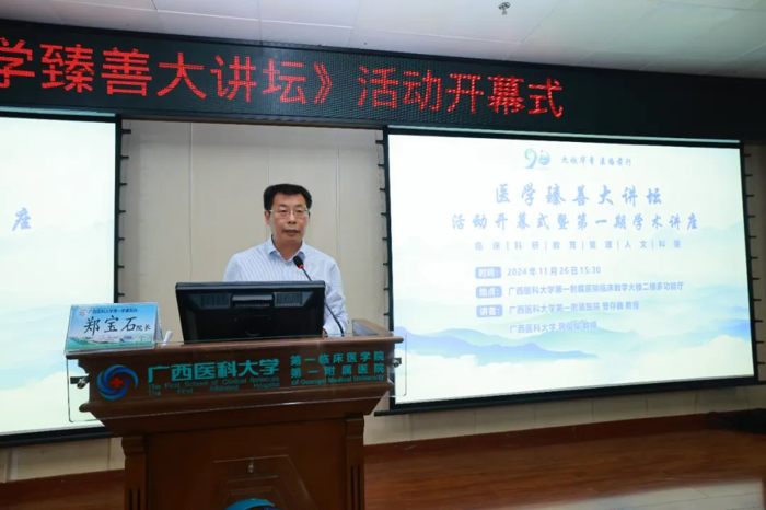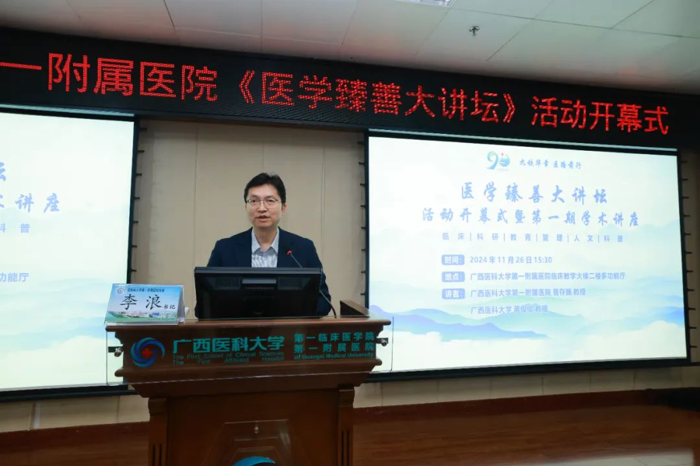 李浪对校领导、授课专家的莅临指导表示欢迎和感谢。他说,新一届班子严格落实自治区党委巡视整改要求,全面加强学科建设、人才引育、科研创新等工作的领导和规划,修订出台了一系列的人才、科研激励制度。他强调,筹划举办“医学臻善大讲坛”是医院因地制宜发展“新质生产力”、提升科研水平以驱动高质量发展的革新举措之一,为广大学术骨干特别是青年人才提供高水平的交流平台,激活学术创造性,培育形成崇尚、热爱并投身科研的良好风气。他以“大学之道,在明明德,在亲民,在止于至善”的古训来勉励和祝福大讲坛旗开得胜、越办越好,希望有更多的名家学者、青年才俊能陆续走上讲坛、交流经验成果、分享成长体会,碰撞出更多学术火花。