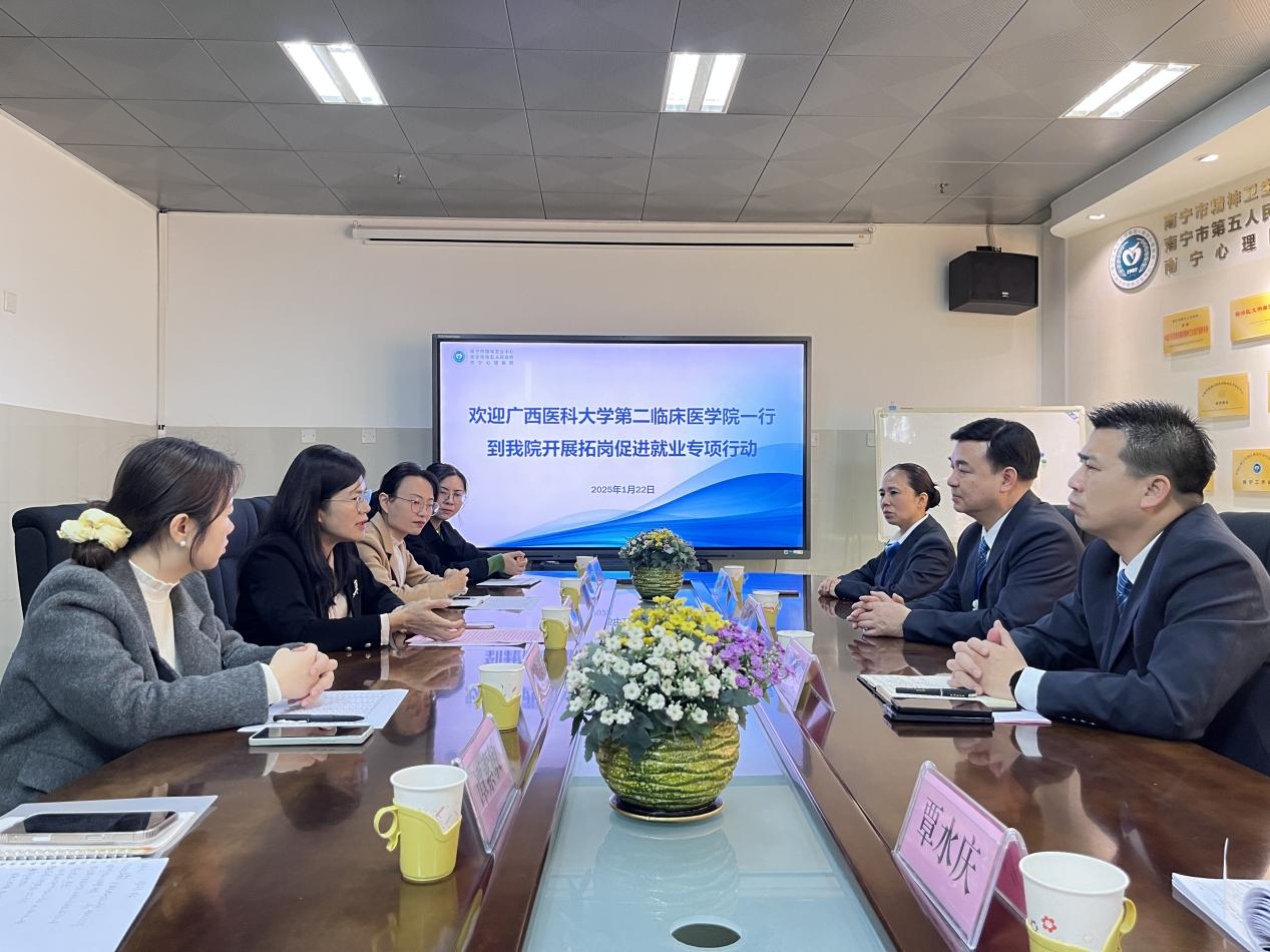 为贯彻落实教育部、学校关于开展2025届高校毕业生“寒假促就业暖心行动”,通过访企拓岗开发更多有利于毕业生发挥所学所长的就业岗位,促进毕业生高质量充分就业。1月22日上午,二附院党委副书记黄惠桥带队赴南宁市第五人民医院开展“寒假促就业暖心行动”暨拓岗促就业专项行动。学生工作办公室主任胡清媛、副主任黄美思及辅导员一行7人参加此次活动。