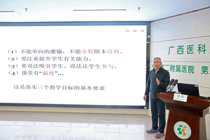 韦庆军为本次培训班致辞,他肯定了上学年二附院在本科教育教学工作中取得的显著成绩,同时,他强调医院要全面把握医学教育新形势,落实立德树人根本任务,夯实教学质量与监控体系,不断推进教育数字化新格局,全面提升教师队伍素质,推动本科教育教学体系高质量发展。