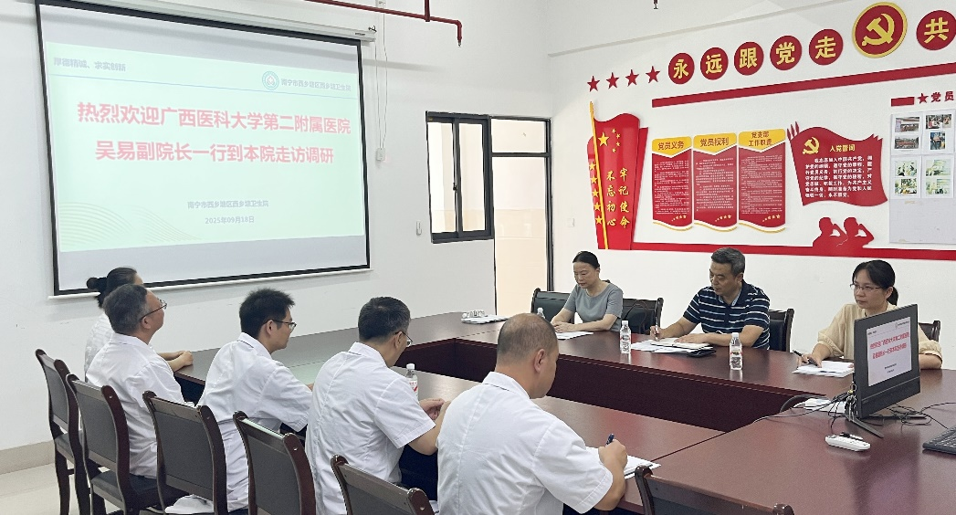 为进一步深化全科住院医师规范化培训教学内涵建设,筑牢基层医疗人才培育根基,2025年9月18日,由吴易副院长带队,教务部副部长林莉、全科专业基地主任雷卓青等一行,赴全科基层实践基地——南宁市西乡塘区西乡塘卫生院开展实地调研。西乡塘卫生院院长李日珍、教学主任赖良昶、教学秘书黄文孔等陪同调研。