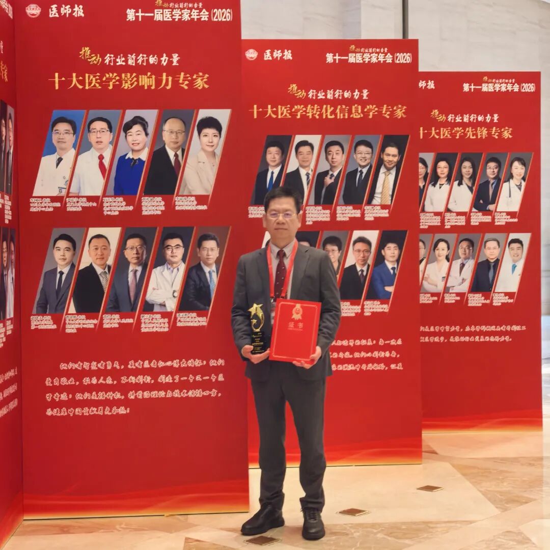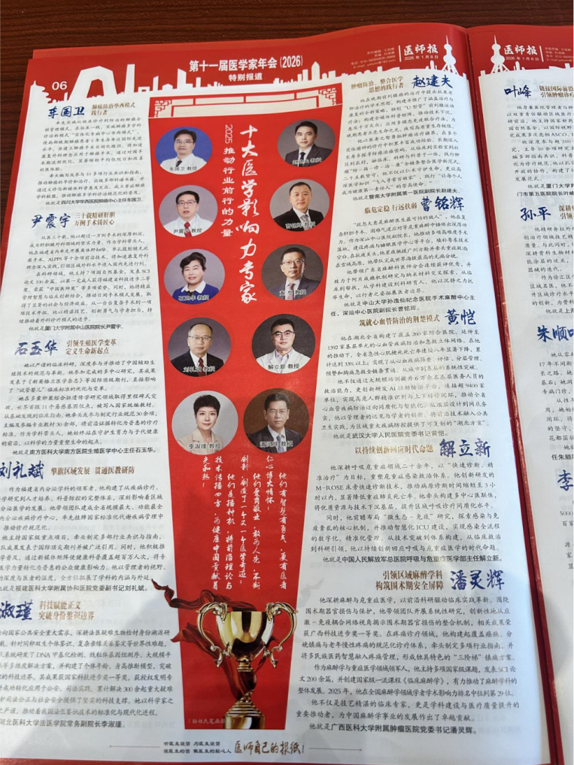 2026年1月9日,在第十一届医学家年会上,由《医师报》社联合多家权威学术机构评选发布的“2025年度十大医学影响力专家”榜单正式揭晓,附属肿瘤医麻醉重症与镇痛学科首席专家潘灵辉教授入选,成为本年度全国医学领域最具学术影响力与行业引领力的专家之一,充分彰显了医院在麻醉学与围术期医学领域的学术实力与学科影响力。