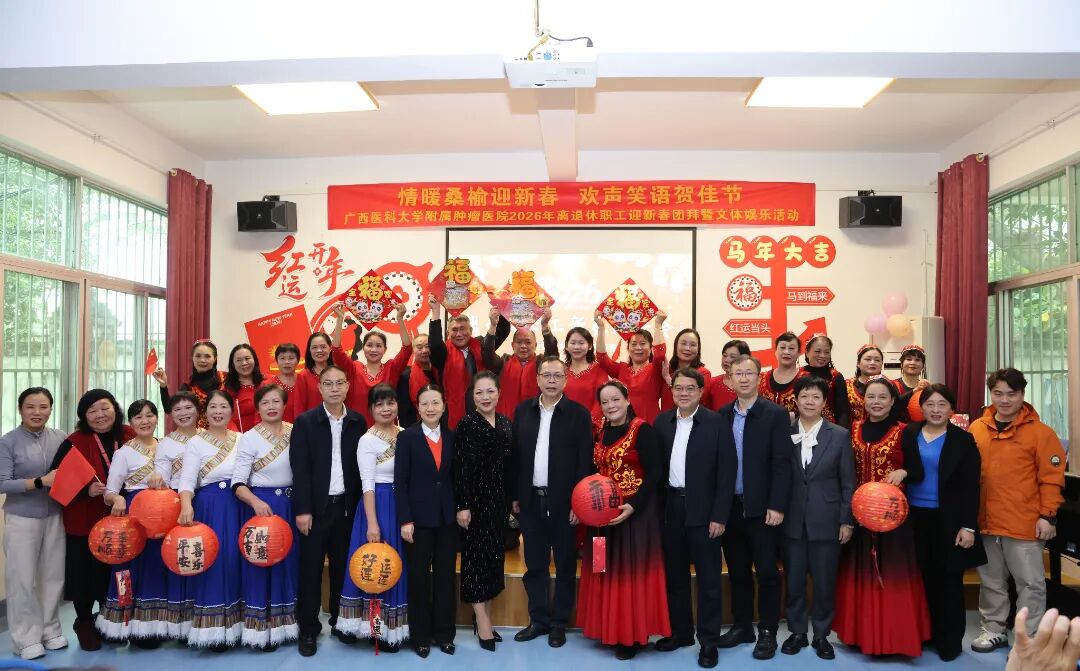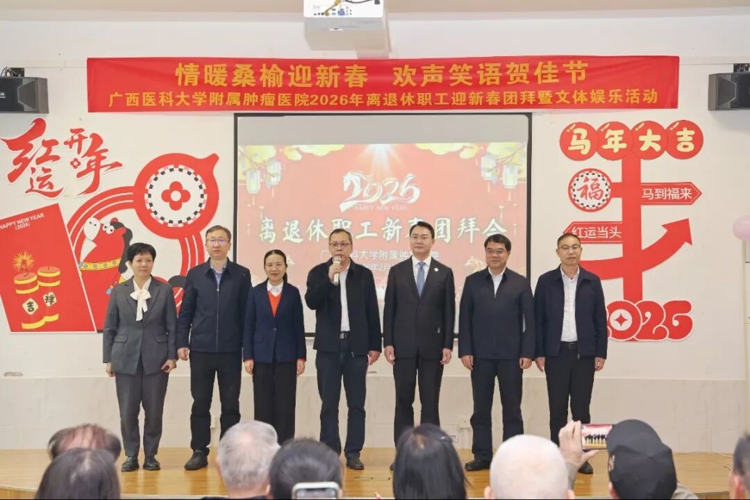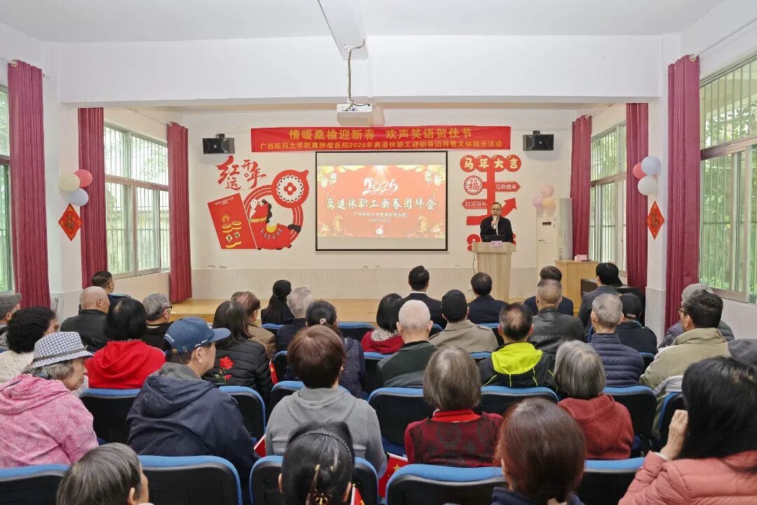 情暖桑榆迎新春,欢声笑语贺佳节。在2026年新春佳节即将到来之际,为切实落实医院对离退休职工的关心关爱,进一步凝聚离退休老同志的向心力,2月4日下午,附属肿瘤医院举办2026年离退休职工迎新春团拜暨文体娱乐活动。全体在家院领导、相关职能科室负责人与百余名离退休老职工欢聚一堂,共叙深厚情谊、共迎新春佳节、现场暖意融融。医院党委副书记、纪委书记谢爱泽主持活动。