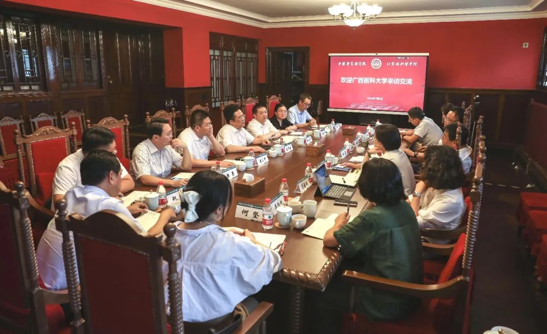 7月9日,曾志羽带队前往中国医学科学院北京协和医学院开展交流学习。并与该院校长王辰院士、院党委副书记张勤、副校长王健伟及相关部门负责人开展座谈交流会。会上,曾志羽表明来访目的并介绍了我校历史沿革、发展现状和两校合作情况。他表示,中国医学科学院北京协和医学院是我国最高医学研究机构和最高医学教育机构,以引领我国医学科技教育发展和维护人民健康为己任,教育人才辈出,科研硕果累累,为我国现代科学医学体系的建立和发展做出了重要贡献。两校有着良好的合作基础和更为广阔的合作空间,希望双方保持密切联系和交流,加强医学开放合作,共同推动高等医学教育事业高质量发展。