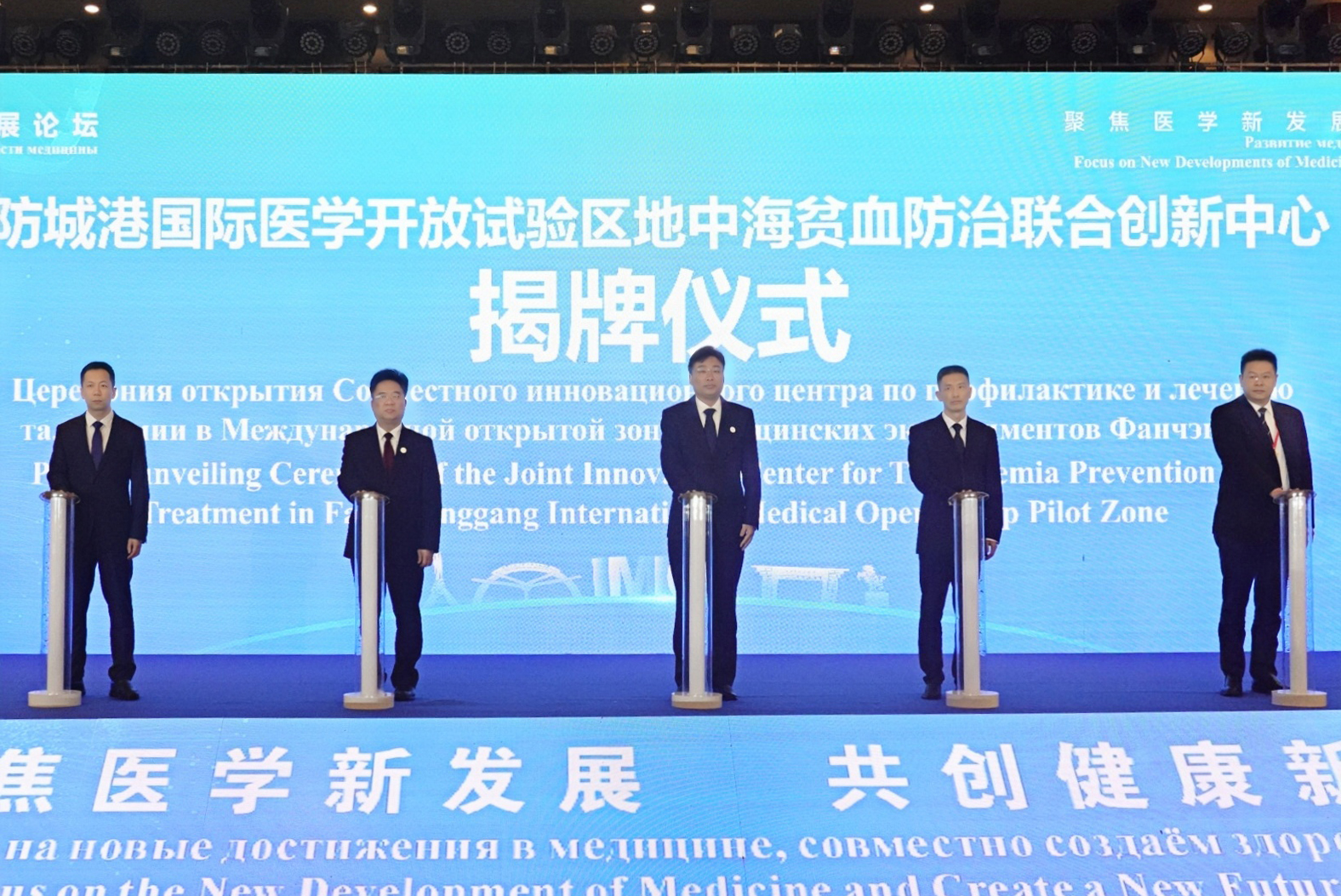 4月29日下午,“防城港国际医学开放试验区地中海贫血防治联合创新中心”揭牌仪式举行。我校校长曾志羽与自治区卫生健康委主任杜振宗、副主任吴兴华,防城港副市长陈光炯、我校副校长唐卫中共同揭牌。据中心规划,该平台将依托广西医科大学国家重点实验室和防城港国际医学开放试验区政策优势,重点建设防治实验室、创新性治疗研发基地、协作网络平台及人才培养基地四大板块,目标打造成为中国—东盟地中海贫血防治的“技术枢纽”和“人才摇篮”。