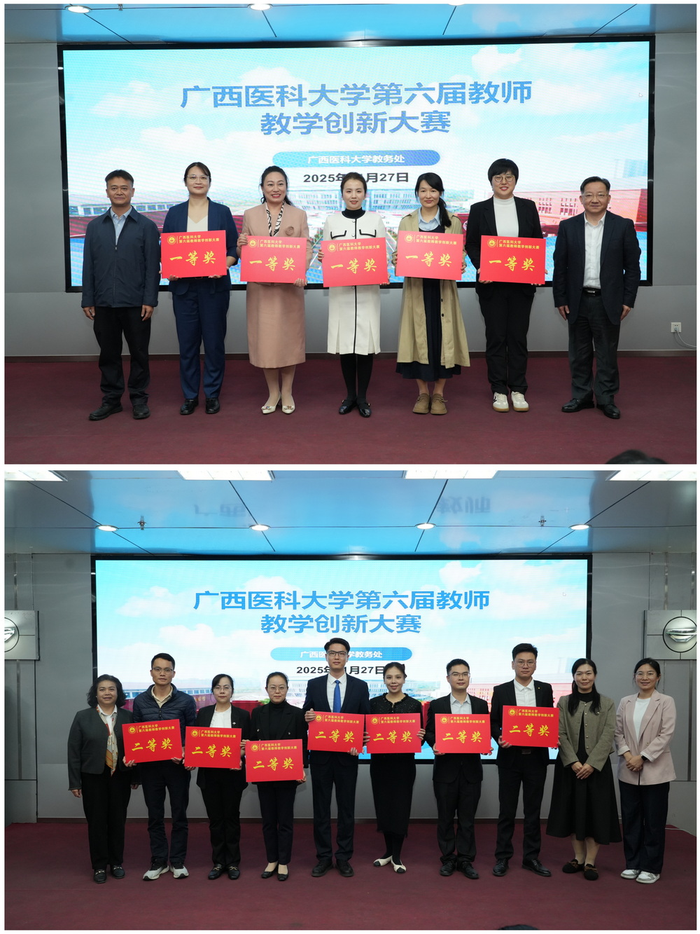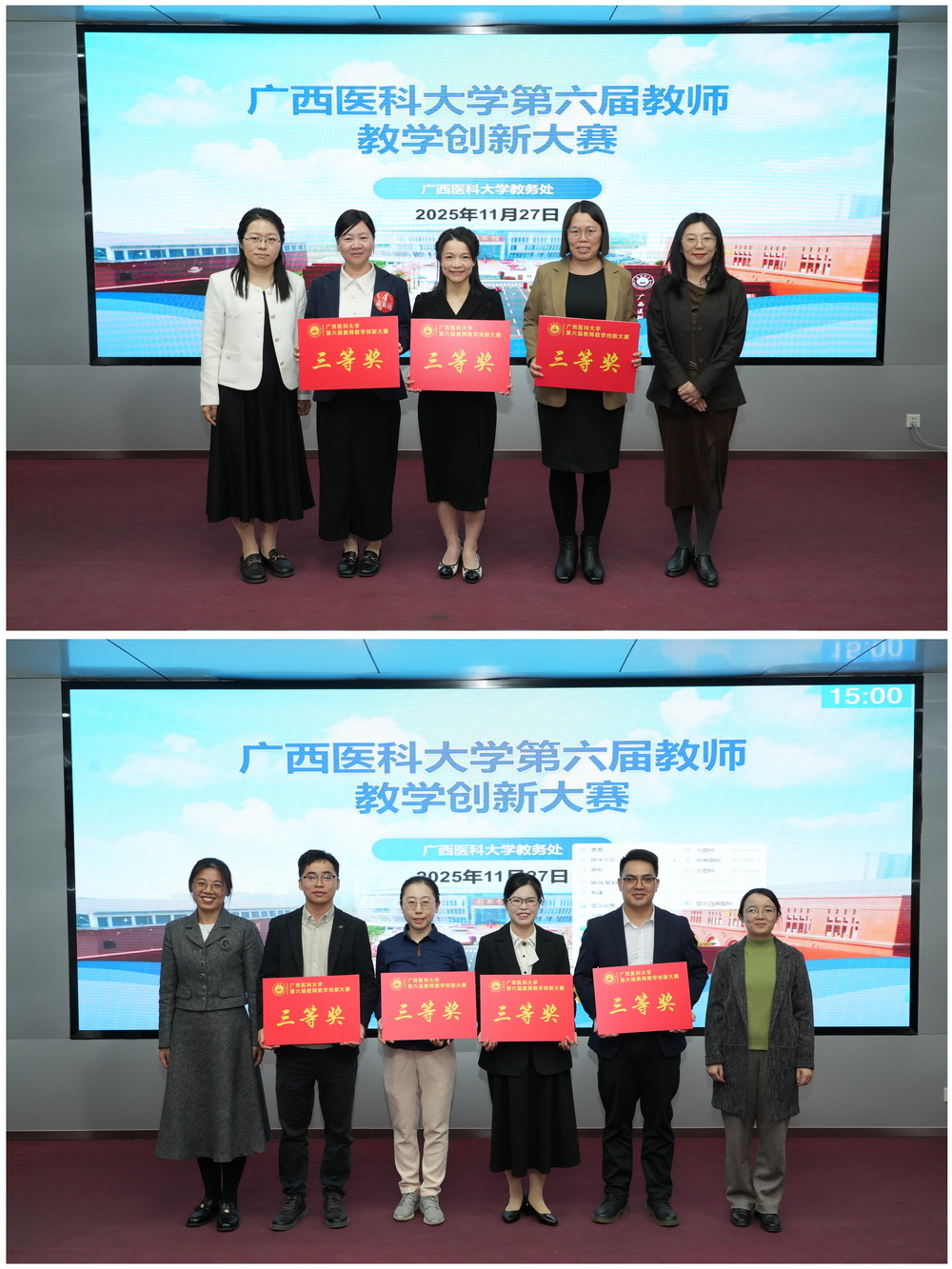 大赛设正高组、副高组、中级及以下组、课程思政组,评委团由历届区级以上教学竞赛获奖者组成。经过激烈角逐,第一临床医学院陈静、基础医学院高灵茜、玉林校区钟欢、基础医学院傅晓茵和体育与健康学院胡苗苗等5个教师团队荣获一等奖,同时还评出二等奖7个、三等奖8个。