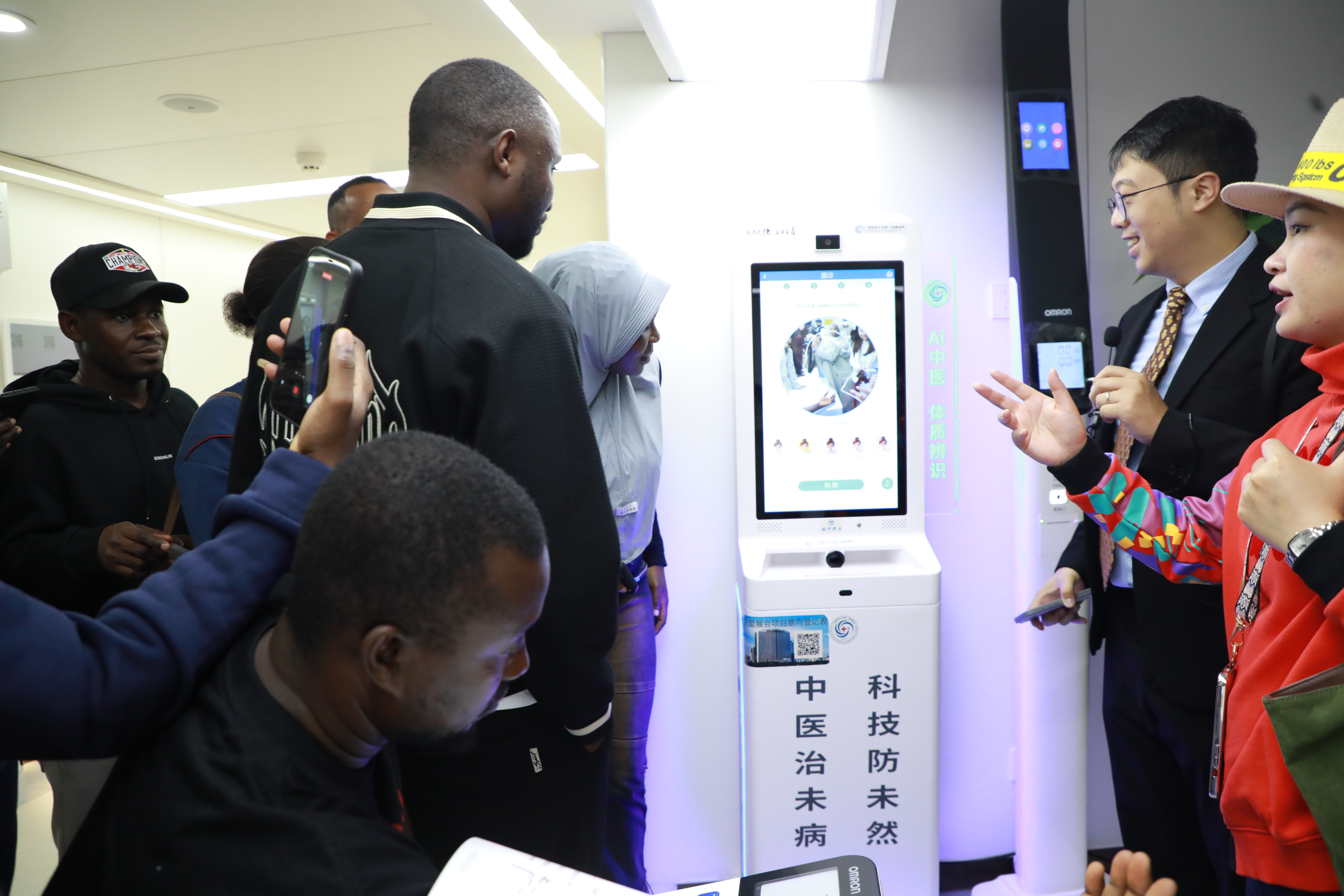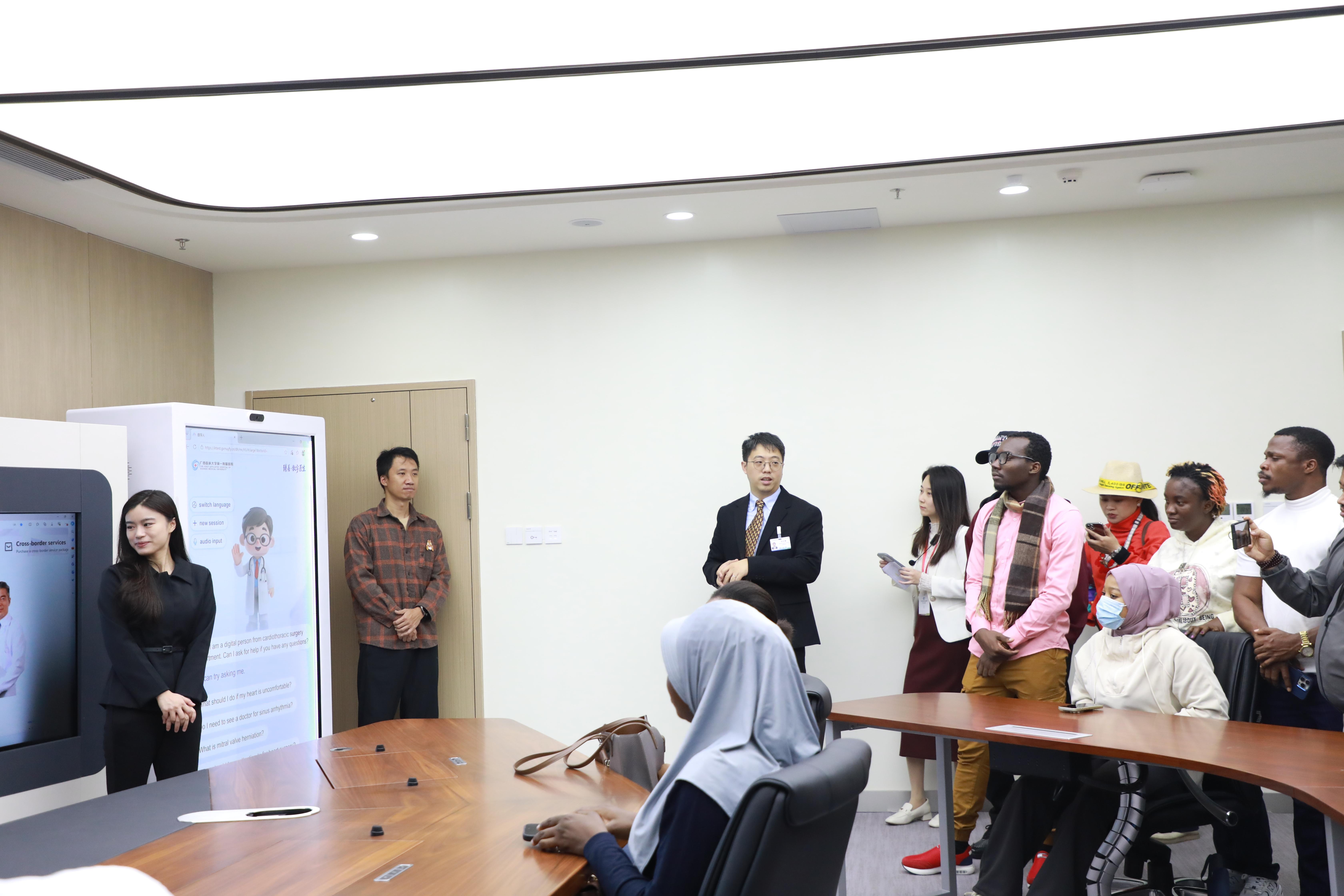 在第一附属医院,参访团实地考察了臻善AI数字医生、AI中医体质辨识机等智能医疗设备,对我校在“人工智能+医疗健康”领域的创新应用表现出浓厚兴趣。参访团还参观了院史馆,深入了解医院发展历程与服务理念。