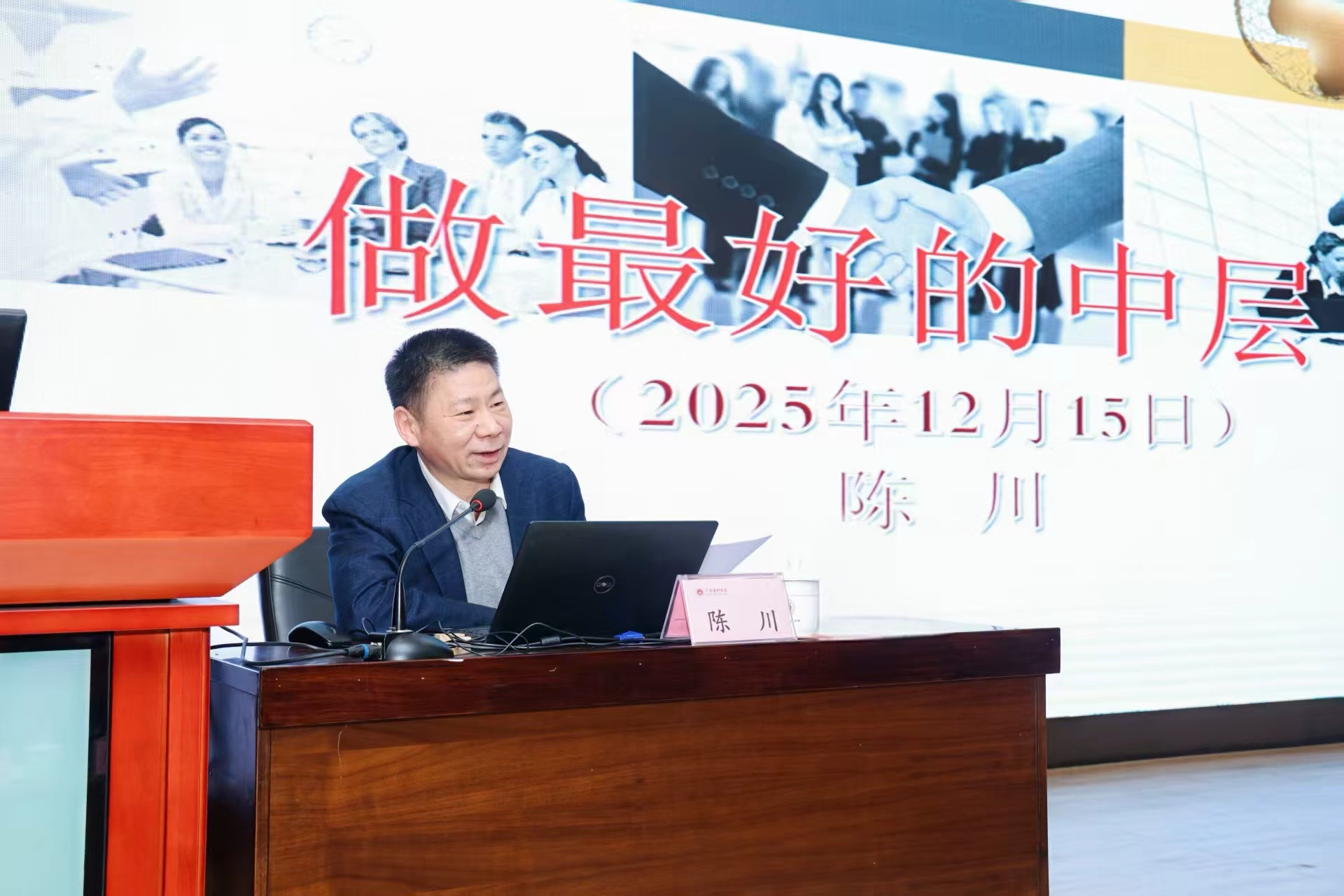 陈川紧扣医学院校高职教育发展需求和干部成长实际,结合自身丰富的干部工作经验,从“怎样当好中层干部”“怎样当好中层正职”“怎样当好中层副职”这三方面进行系统讲授,通过详实的案例和生动的阐释,凝练提出20条“经验方”,指引干部讲政治、崇实干、业务精、重创新、善落实,做到知责于心、担责于身、履责于行。他重点剖析了中层干部“对上负责、对己负责、对下负责”的三重职责定位,系统阐释了“守土有责、负责、尽责”的履责要求。陈川强调,学校内设机构应当定位为“职能部门”而非“管理部门”,要多换位思考,主动为教学科研服务、为师生员工服务,寓管理于服务之中。