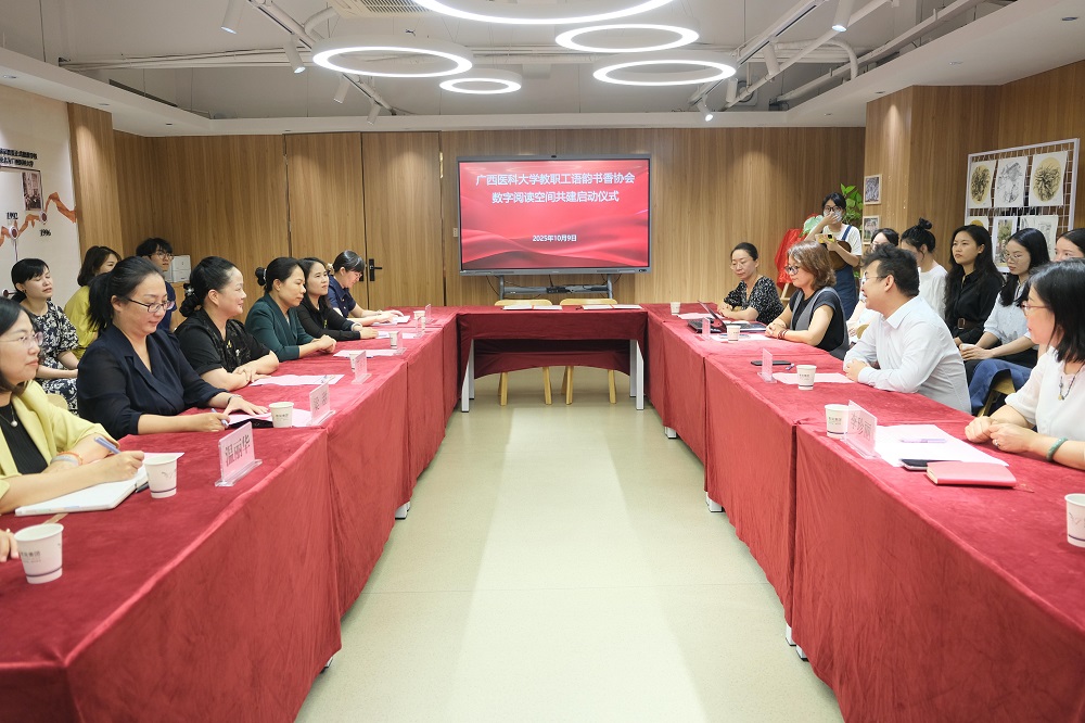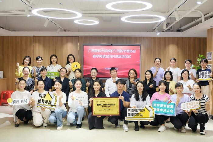 为探索“阅读+”新模式,创设“阅读+”新空间,10月9日下午,广西医科大学教职工语韵书香协会在八桂书苑举行数字阅读空间共建启动仪式。校工会常务副主席吴树华,校教育发展基金会理事长黄茜,工会副主席蒋洪涛,语韵书香协会会长梁甜、副会长刘俊、温丽华,广西屹牙集团董事长黄峥容,帆书广西运营中心执行负责人姚瑶,八桂书苑负责人李珍丽及协会会员代表参加本次活动,活动由梁甜主持。
