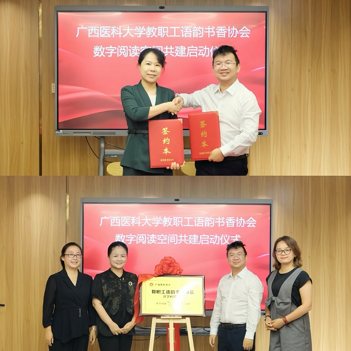 吴树华表示,数字阅读空间是拥抱数字时代、拓展阅读边界的有益探索,希望协会运用好各种阅读资源,为教职工提供更好的文化交流平台,将协会打造成为有温度、有文化、有情怀的书香阵地。黄茜向广西屹牙集团支持母校校园文化建设表示衷心感谢,她表示会依法依规用好爱心捐款,充分发挥数字阅读空间的文化辐射作用。黄峥容表达了对母校培养的感激之情,他表示共建数字阅读空间,是积极响应国家“全民阅读”号召,支持医学教育事业发展的具体行动。姚瑶介绍了帆书在数字阅读领域的资源优势和服务模式,李珍丽表示将全力支持数字阅读空间的运营,为教职工提供舒适便捷的阅读环境。