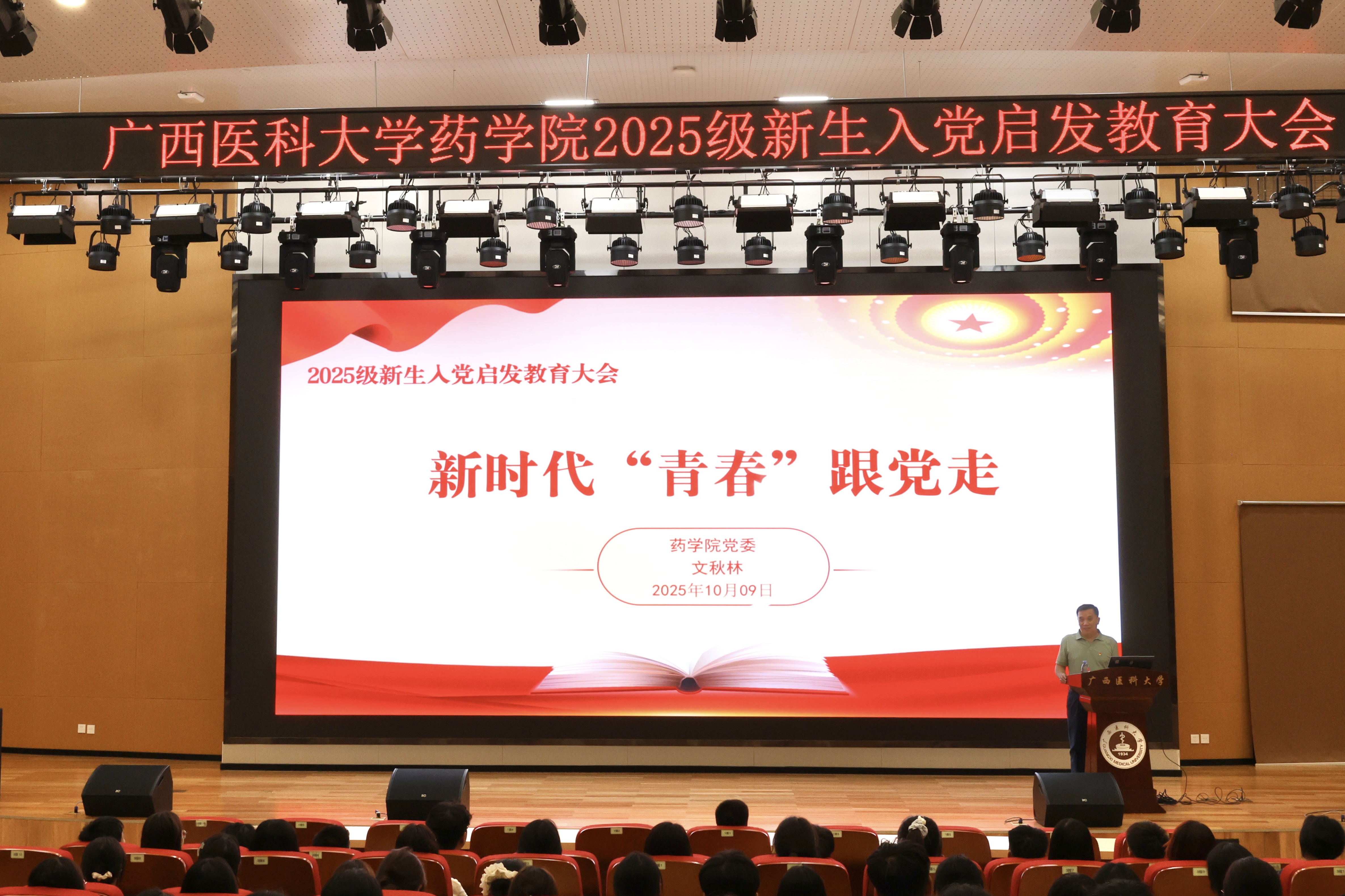为引导青年大学生积极向党组织靠拢,10月9日晚,药学院在武鸣校区图书馆鼎新报告厅举行2025级本科生入党启发教育大会。学院党委书记文秋林、学工办胡承光老师以及373名本科新生参加会议,会议由胡承光主持。