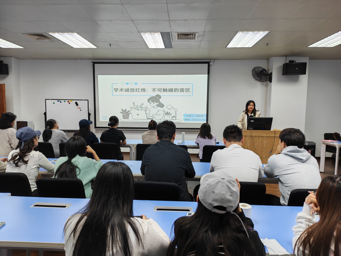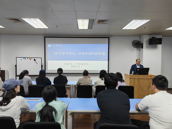 为加强研究生科研诚信意识,弘扬科学家精神,引导研究生学子坚守学术初心,11月11日,外国语学院在校本部综合楼304教室举行主题为“坚守学术初心地,共筑科研诚信墙”的研究生科研诚信教育活动。活动由外国语学院向课书博士主讲,学院党委副书记黄万获主持活动。