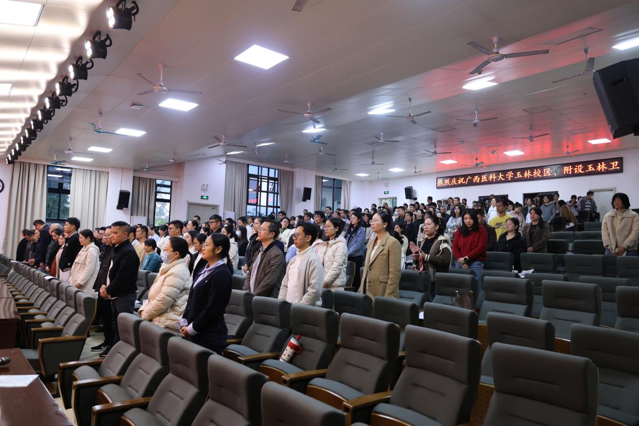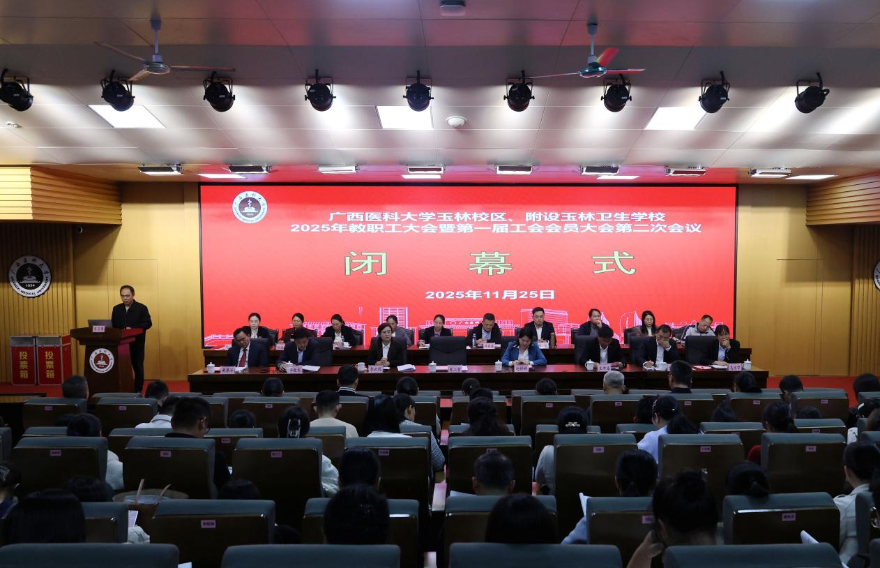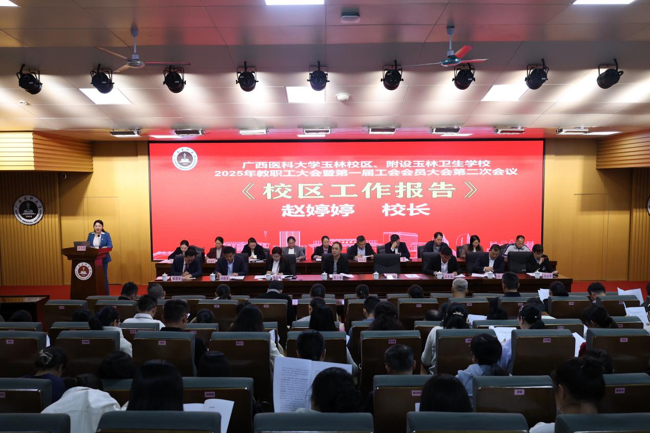 正值庆祝中华全国总工会成立100周年、全区上下深入学习贯彻党的二十届四中全会精神的关键时期,11月25日,玉林校区、附设玉林卫生学校2025年教职工大会暨第一届工会会员大会第二次会议在6号楼报告厅召开。校区全体领导、教职工、工会会员近230人参加。会议由玉林校区、附设玉林卫生学校党委副书记、校长赵婷婷主持。