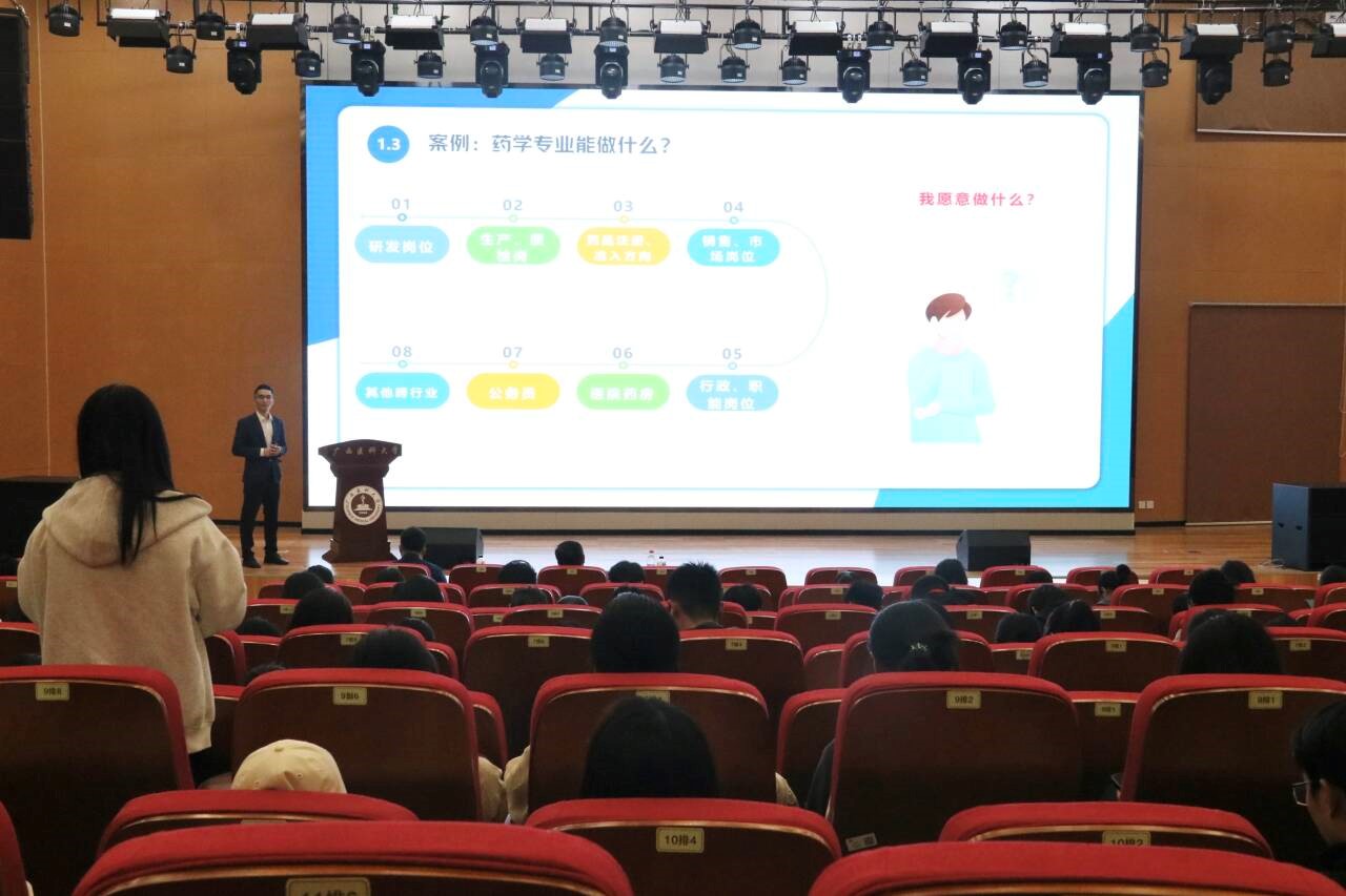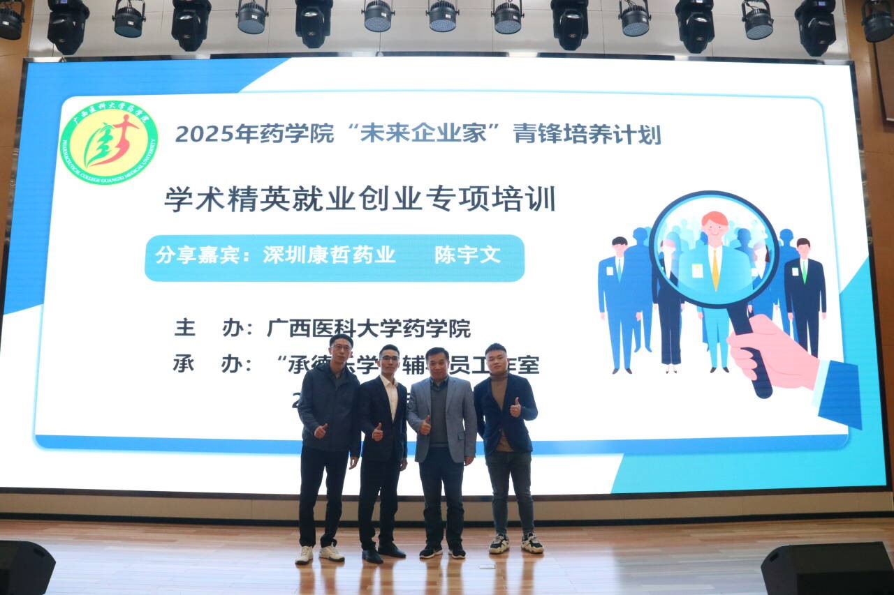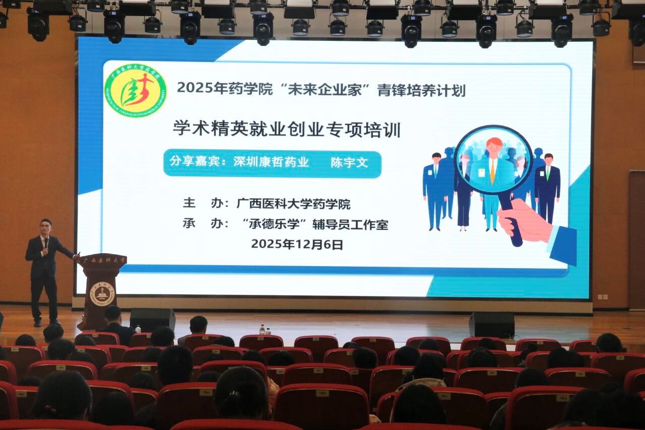 为助力学生更好地做好职业规划,培养学生未来企业家精神,12月6日晚,药学院在武鸣校区图书馆鼎新报告厅举办“未来企业家”青锋培养计划就业创业专项培训。本次培训邀请了教学实践基地共建单位——深圳康哲药业有限公司广西地区经理陈宇文,招聘经理廖成蒙药作专业讲授和就业辅导。学院党委书记文秋林和400余名学生参加了培训,培训由学工办主任谭斌主持。