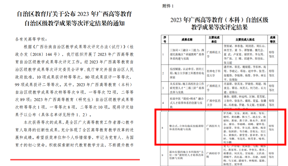近日,自治区教育厅公布了关于2023 年广西高等教育自治区级教学成果等次评定结果的通知,二附院《整合式、立体化临床技能课程体系的构建与实践》荣获2023年广西高等教育(本科)自治区级教学成果等次评定特等奖。这是二附院潜心教书育人取得的创新性成果,实现二附院自治区级教学成果“零”的突破。