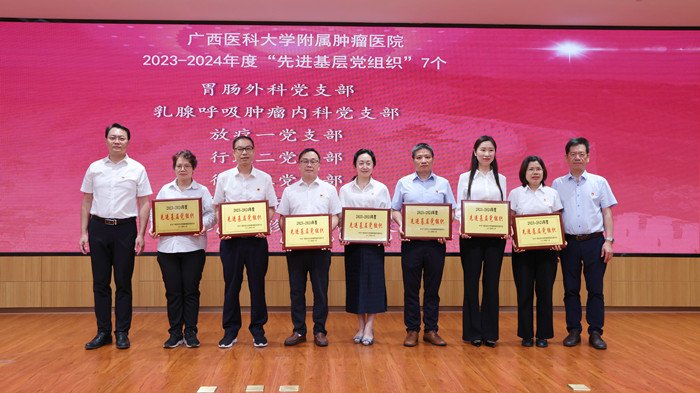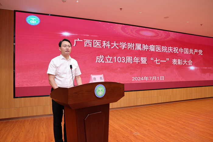 7月1日下午,中共广西医科大学附属肿瘤医院委员会召开庆祝中国共产党成立103周年暨“七一”表彰大会。全体院领导、党委委员、纪委委员,各党支部书记、全体中层干部,医院“两优一先”表彰集体和个人代表、新党员等参加大会。