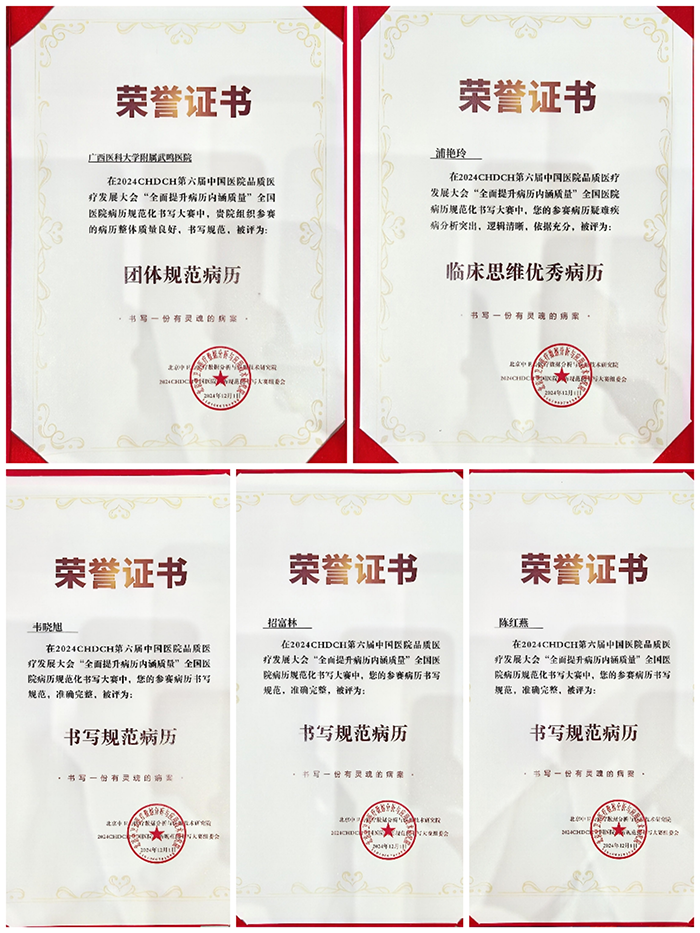 近日,第六届中国医院品质医疗发展大会暨2024年全面提升病历内涵质量医院病历规范化书写大赛在无锡举行,全国128家医院共400多份病历参加比赛,附属武鸣医院4份病历参赛并获多项殊荣,广西医科大学附属武鸣医院获“团体规范病历奖”,浦艳玲医师获“临床思维优秀病历”奖,陈红燕、招富林、韦晓旭医师获“书写规范病历个人奖”。