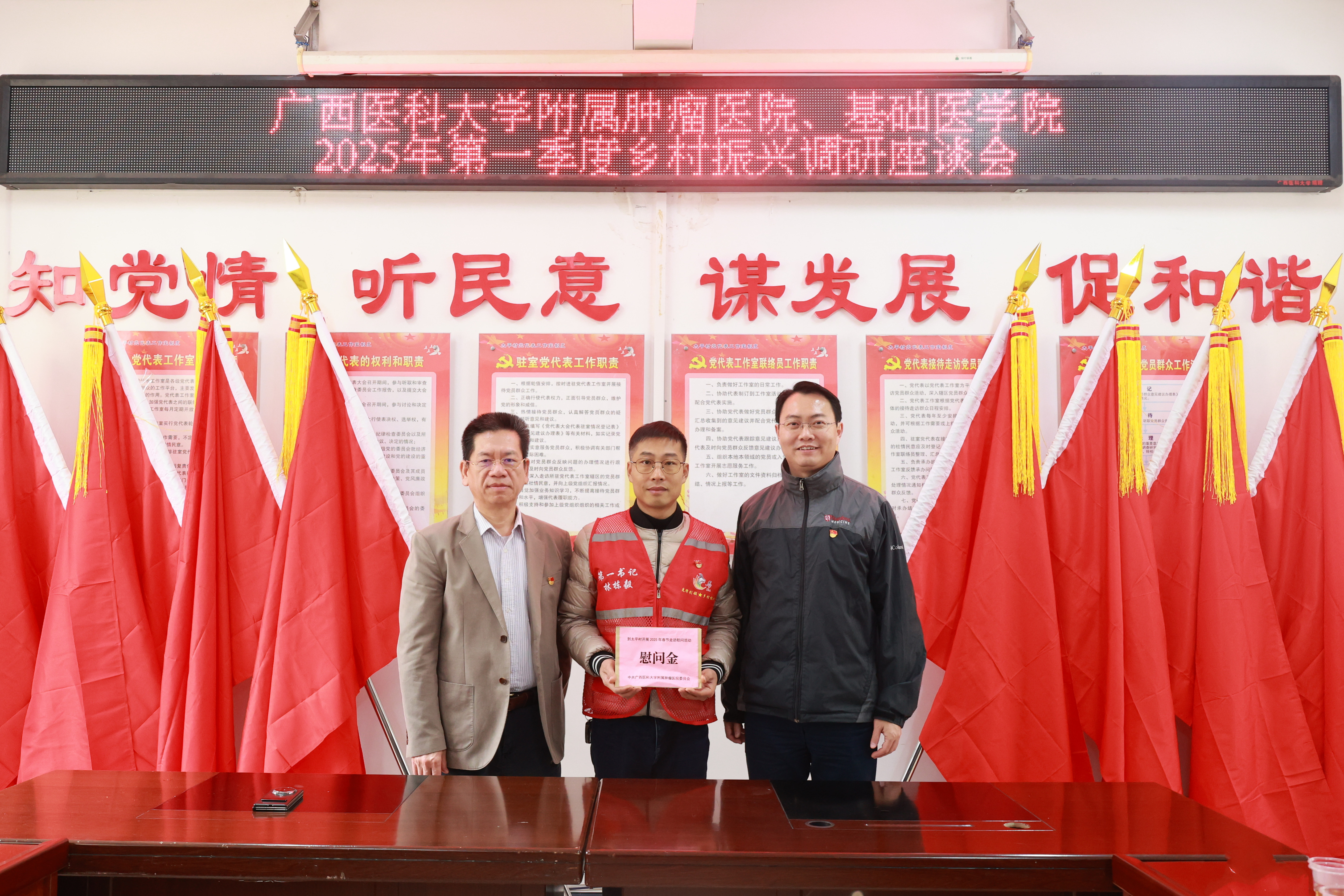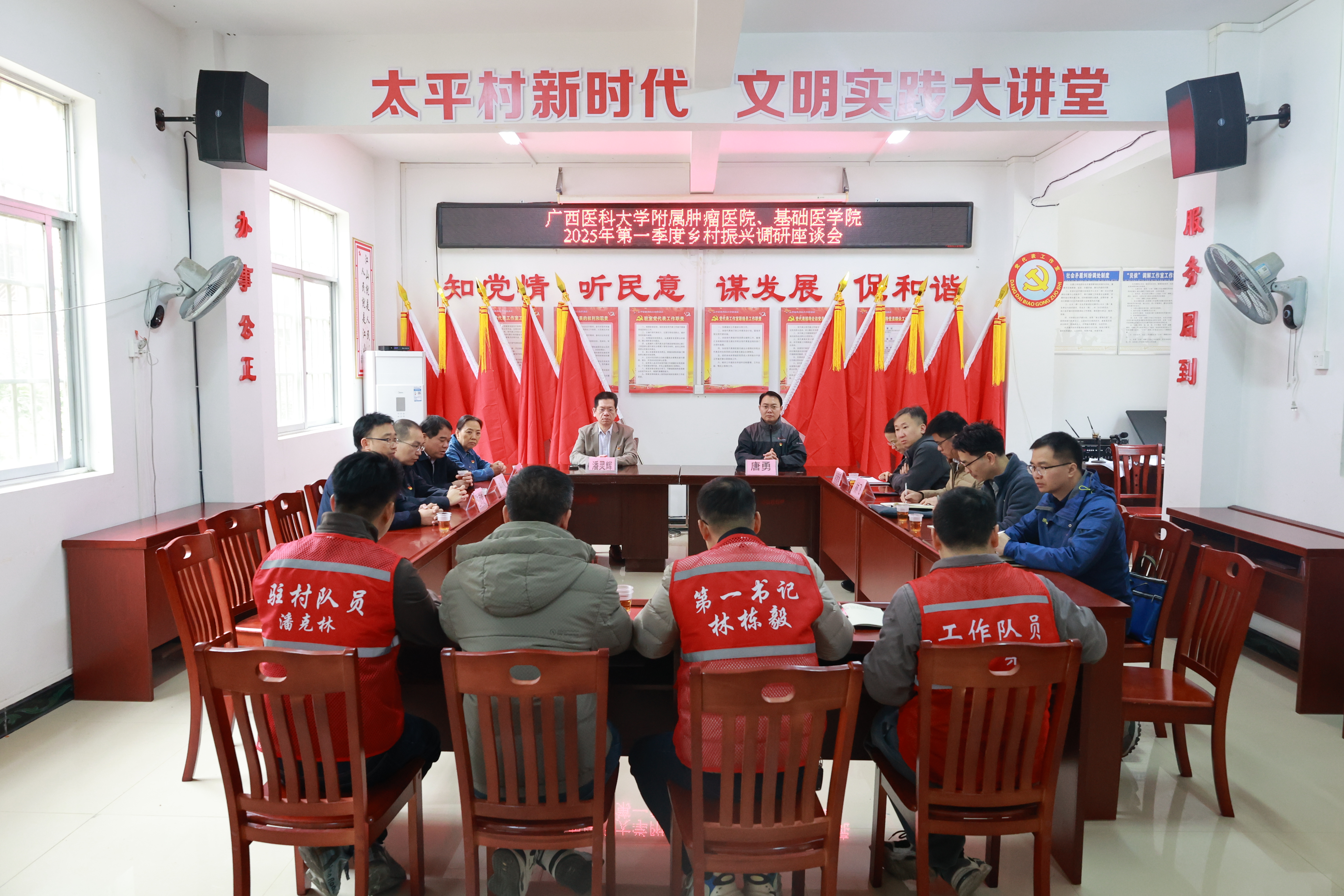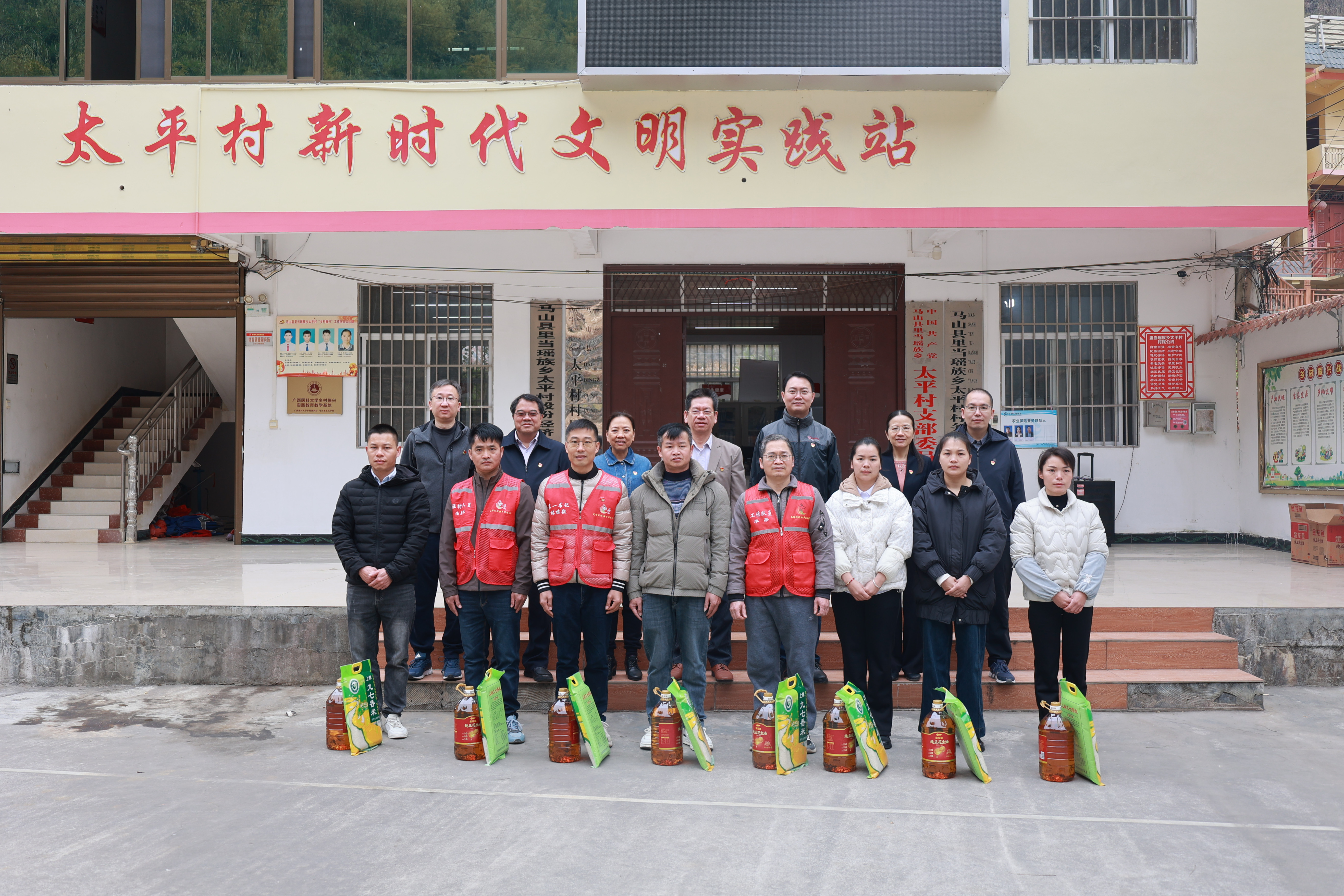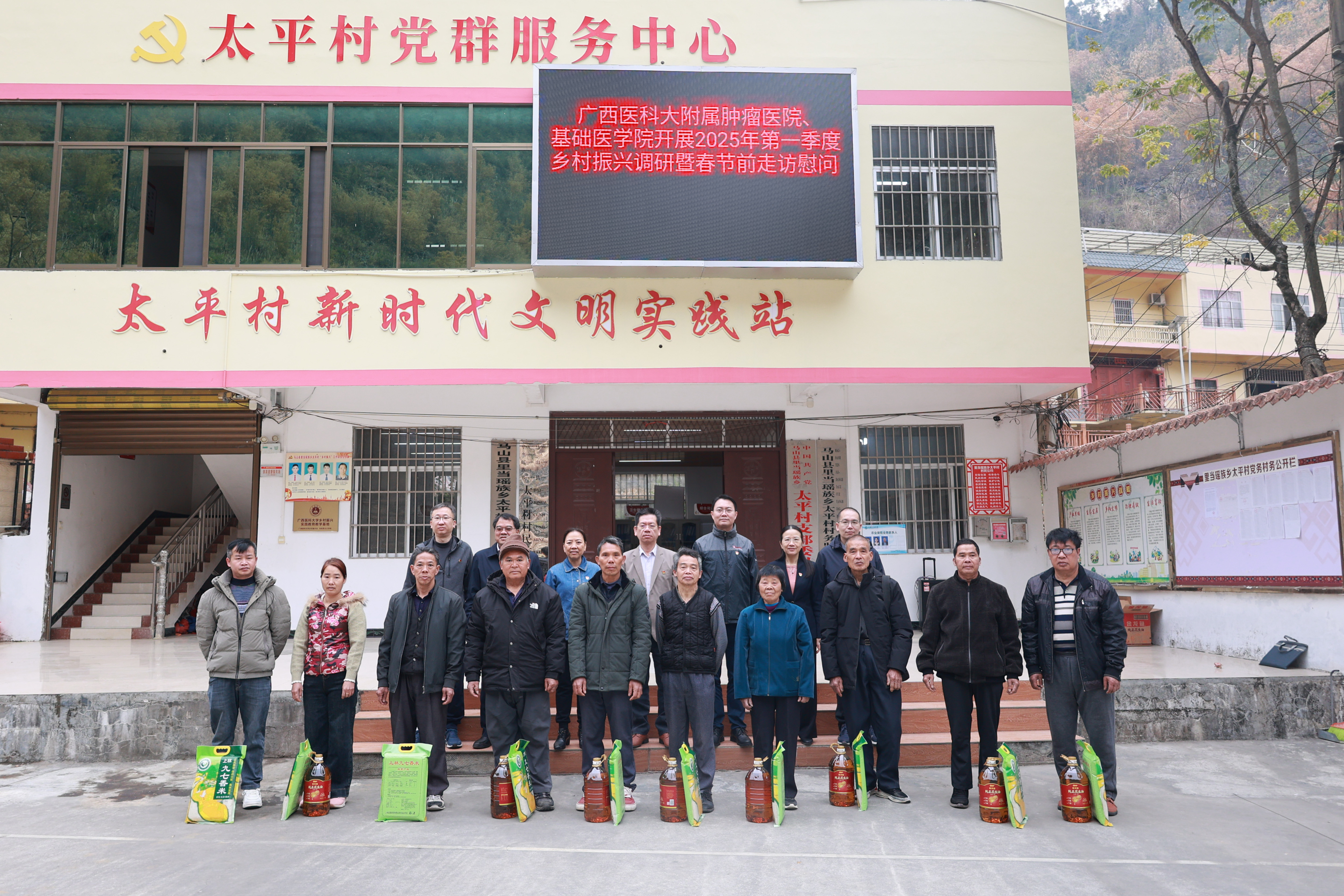 1月21日,附属肿瘤医院党委组织到定点帮扶村马山县里当瑶族乡太平村开展2025年第一季度乡村振兴调研暨春节前慰问活动。医院党委书记潘灵辉,院长唐勇,党委副书记叶凤、谢爱泽,副院长钟小斌、林飞以及基础医学院党委副书记王闻楚等参加活动。