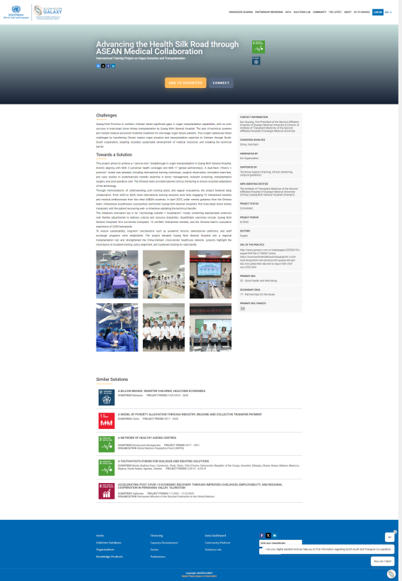 近日,二附院移植医学研究所主导的 “器官捐献与移植国际培训项目”,因在知识共享、技术赋能与跨国健康合作方面的创新模式与扎实成效,成功入选联合国南南合作与三方合作优秀实践案例,并正式上线联合国全球南南合作核心展示平台(Solutions Lab)。这标志着该项目作为医疗领域国际合作与能力建设的典范,获得了国际社会的权威认可。