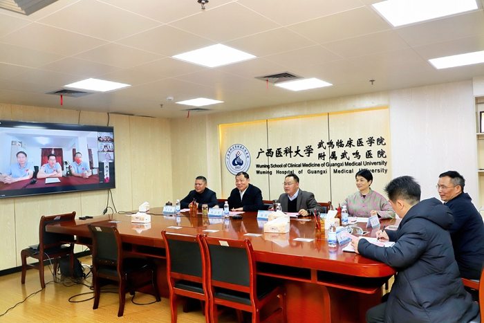 新春佳节来临之际,2月11日下午,附属武鸣医院在1号楼21楼1号会议室召开2026年援非医疗队和驻港人员新春慰问视频座谈会。医院党委书记朱小东,院长张剑锋,党委副书记、纪委书记潘文海,副书记段敏超,副院长陈茂伟,总会计师黄立斌及相关职能科室负责人参加活动。座谈会由张剑锋主持。