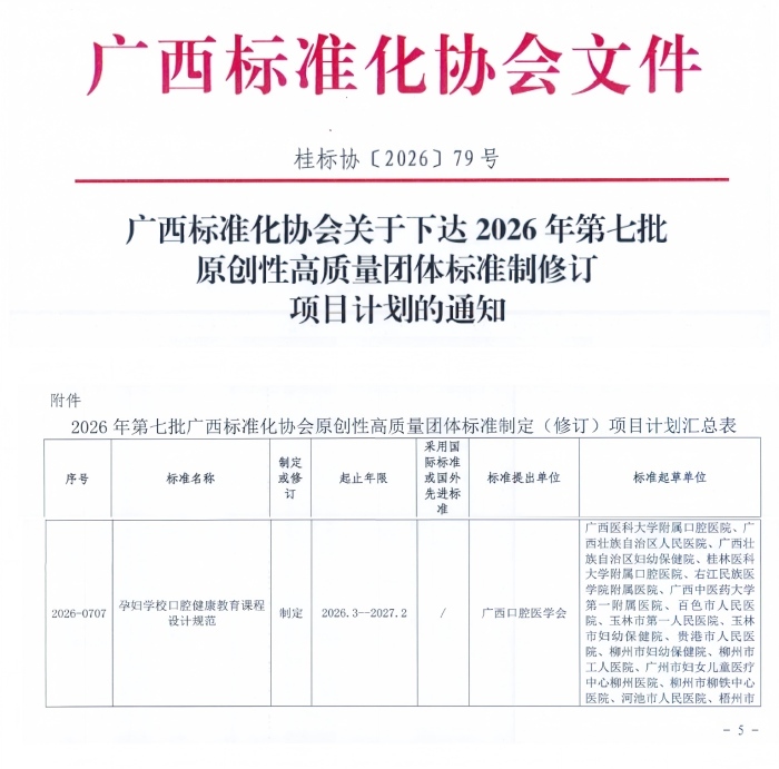 近日,广西壮族自治区标准化协会发布了《2026年第七批原创性高质量团体标准制修订项目计划》,由附属口腔医院牵头制定的《孕妇学校口腔健康教育课程设计规范》团体标准正式获批立项。该标准由广西口腔医学会副秘书长、附属口腔医院口腔预防科主任邱荣敏教授作为第一起草人,联合广西壮族自治区人民医院、广西壮族自治区妇幼保健院等多家单位共同制定。该标准的成功立项,填补了区内孕妇口腔健康教育规范化建设的空白,标志着广西在口腔健康促进工作将迈入规范化、标准化新阶段,对提升全区孕产妇口腔健康水平高质量发展提供了重要技术支撑,具有里程碑式的意义。