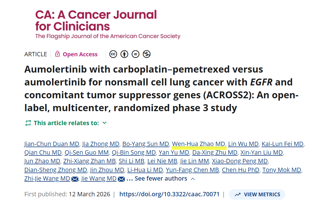 3月12日,国际顶级肿瘤学期刊《CA: A Cancer Journal for Clinicians》(最新影响因子232.4)在线发表了由中国医学科学院肿瘤医院王洁教授牵头发起的ACROSS2 Ⅲ期临床研究成果,开创了该期刊创刊76年以来首次发表中国原创肺癌精准治疗研究的先河。广西医科大学附属肿瘤医院呼吸肿瘤内科副主任赵文华作为共同第一作者深度参与此项研究,标志着医院在肺癌临床研究领域取得重大突破。