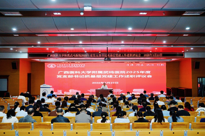 3月23日下午,附属武鸣医院召开2025年度党支部书记抓基层党建工作述职评议会。广西医科大学党委组织部副部长张孟见列席指导,医院党委书记朱小东主持会议,医院党委领导班子成员、各党支部书记及党务工作者代表、党群部门负责人、师生代表参会。