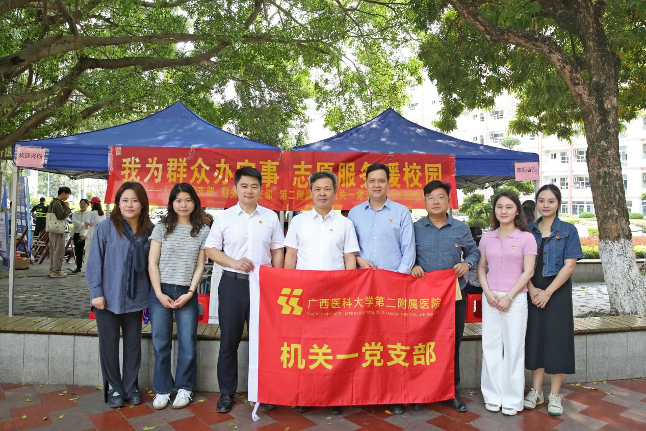 为深化党建引领基层服务效能,切实为广大师生办实事、解难题,3月26日,广西医科大学人事处党支部、财务处党支部和广西医科大学第二附属医院机关一党支部在校本部喷泉广场开展志愿服务活动,以实际行动践行“我为群众办实事”的初心使命,传递志愿服务温暖。