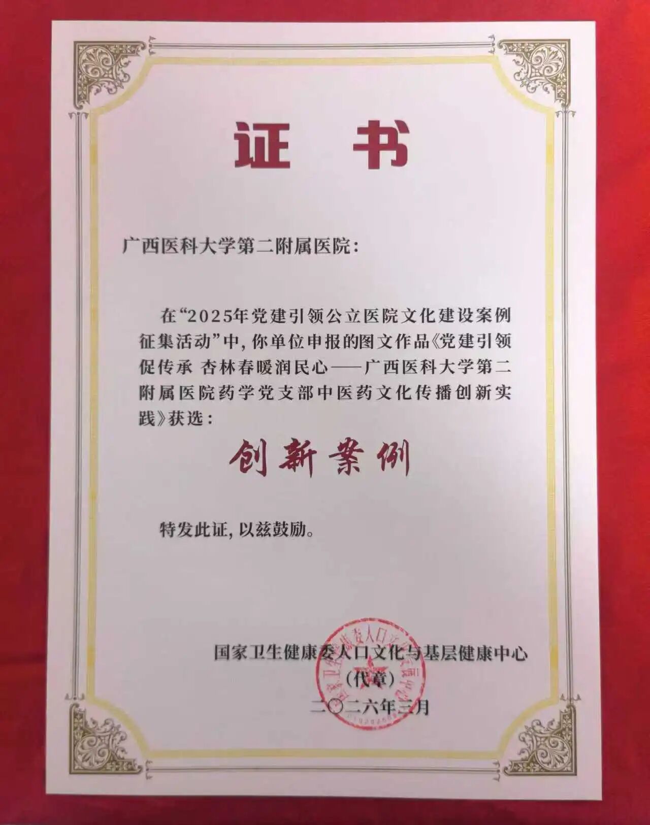 3月28日,由国家卫生健康委人口文化与基层健康中心主办的2025-2026党建引领公立医院文化建设经验交流活动会在南宁举行,广西医科大学第二附属医院药学党支部选送的《党建引领促传承 杏林春暖润民心——中医药文化传播创新实践项目》,从众多参赛作品中脱颖而出,荣获大会创新案例。