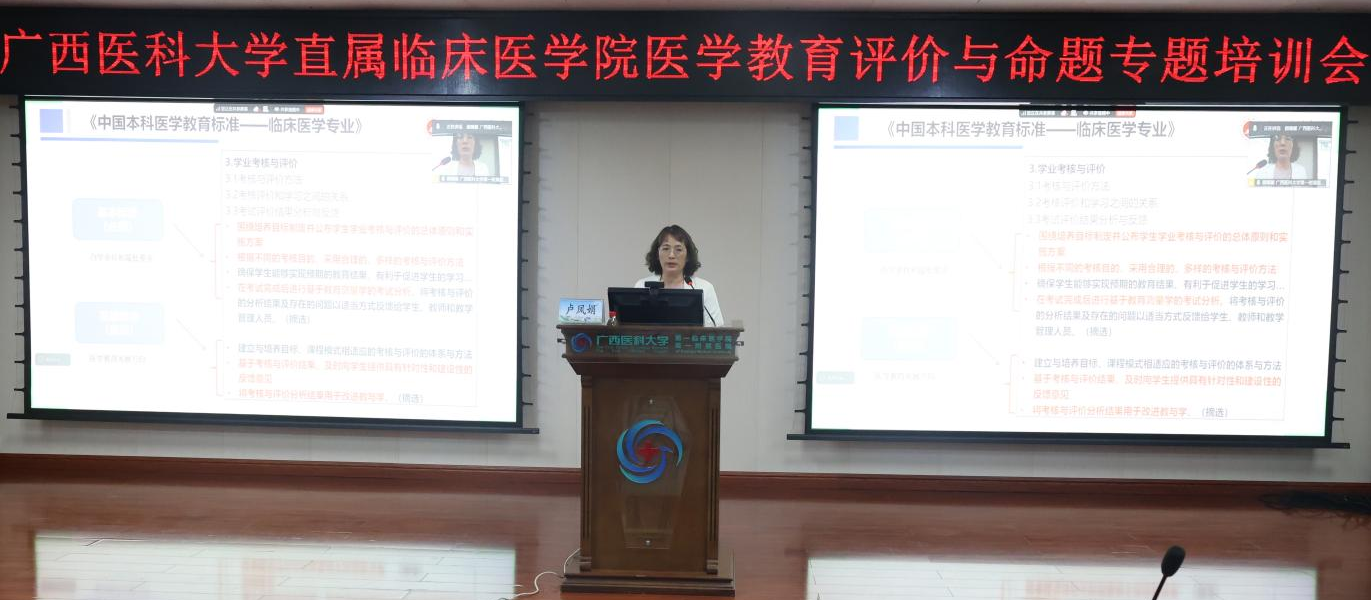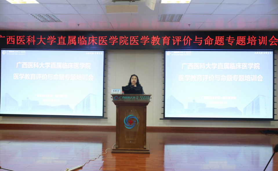 为深化医学教育评价改革,规范命题流程,整体提升命题质量, 4月1日下午,第一临床医学院教务部牵头组织第二临床医学院、肿瘤医学院及武鸣医学院教务部,在临床教学大楼二楼多功能厅举办联合培训会。会议采用“线上+线下”同步模式,各直属临床医学院专业负责人、教研室主任、教学秘书、命题小组成员及一线教师共计180余人参加培训。
