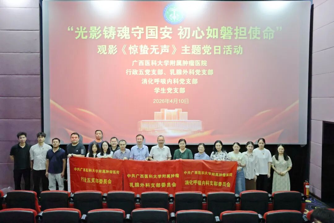 在我国第11个全民国家安全教育日(2026年4月15日)即将到来之际,4月10日晚,广西医科大学附属肿瘤医院行政五党支部、乳腺外科党支部、消化呼吸内科党支部联合学生党支部开展“光影铸魂守国安·初心如磐担使命”主题党日活动,组织师生党员共同观看国家安全题材影片《惊蛰无声》。医院党委书记黄勇、党委副书记林飞出席活动,各党支部师生党员近百人参加。