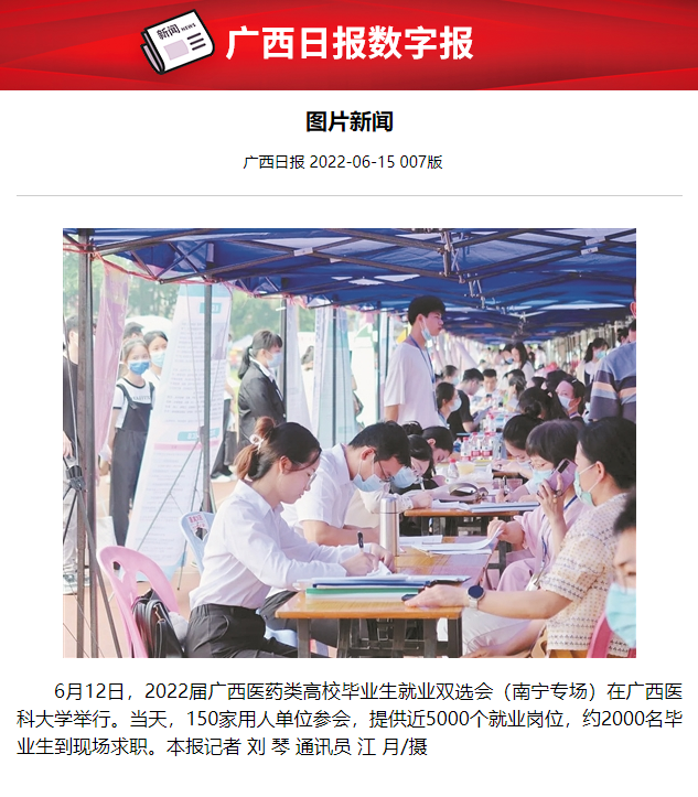 近日,《广西日报》数字报第7版报道了我校举行2022届广西医药类高校毕业生就业双选会(南宁专场)。当天,150家用人单位参会,提供近5000个就业岗位,约2000名毕业生到现场求职。