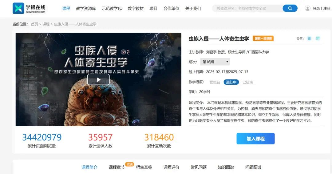 在智慧课堂中,广西医科大学刘登宇教授负责的课程《人体寄生虫学》既是国家级线上一流课程,也是国家级线上线下混合式一流课程,在数字化转型浪潮中也升级为智慧课程,并实现了全国范围的共享运行。通过超星泛雅智慧课程平台,课程团队整合优质教学资源,挖掘课程地方特色,探索先进的教学模式,提升教学质量和学生的学习体验。