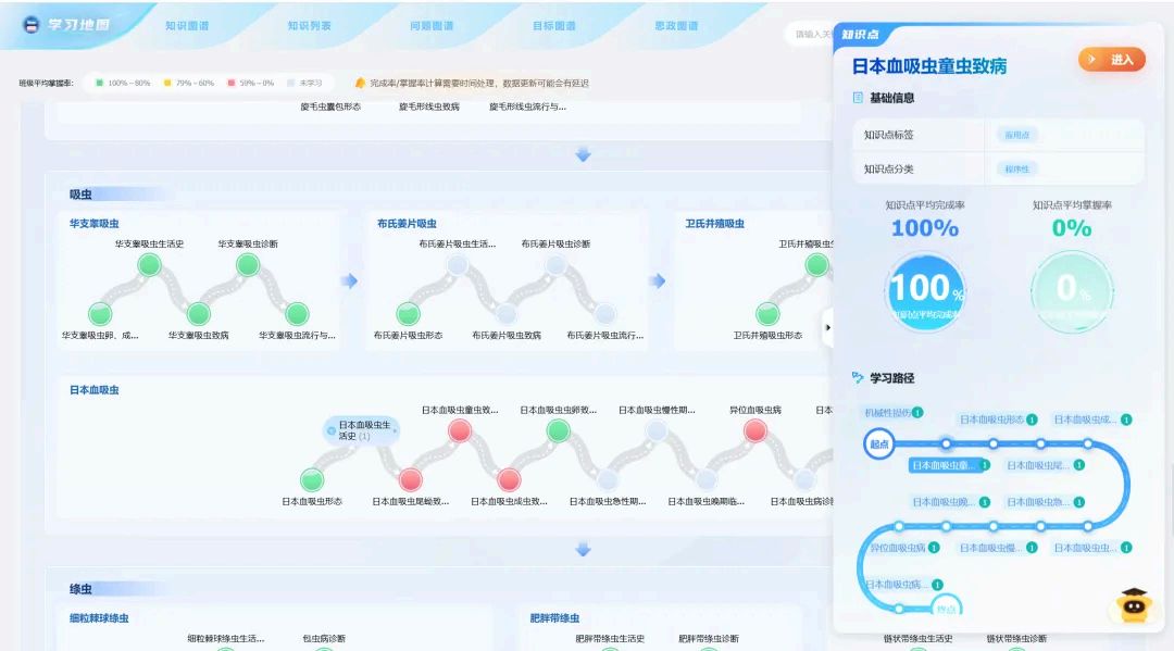基于学生的学习进度和能力水平,知识图谱能够智能规划最优学习路径,推荐相关联的学习资源和进阶挑战,为学生提供个性化学习服务,确保学习既高效又有针对性。通过案例分析设置多个基本问题、组合问题和复杂问题,在帮助学生自主构建寄生虫知识体系的同时,强化学生利用基础知识解决实际临床问题的能力,为以后从事专业工作和进行科学研究打下基础。
