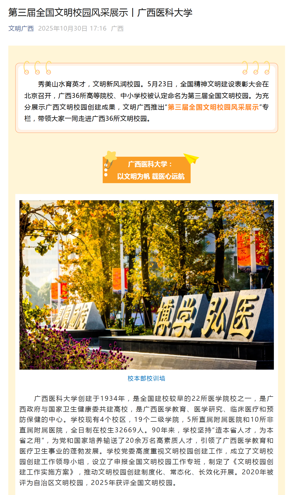 2025年10月30日,文明广西微信公众号以《第三届全国文明校园风采展示丨广西医科大学》为题,报道我校创建全国文明校园经验。