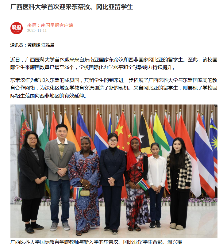2025年11月11日,南国早报客户端报道我校首次迎来来自东南亚国家东帝汶和西非国家冈比亚的留学生。至此,我校国际学生来源国数量已增至86个,学校国际化办学水平和全球影响力持续提升。