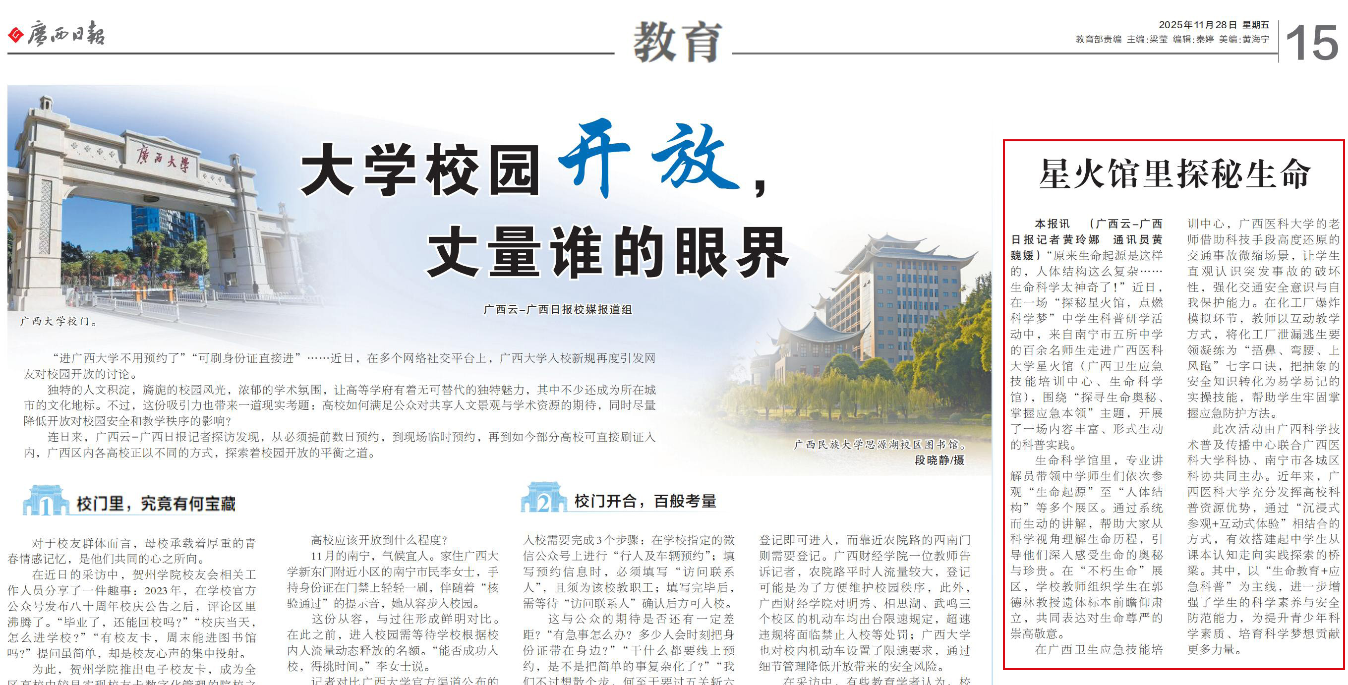 2025年11月28日,广西日报报道来自南宁市五所中学的百余名师生走进广西医科大学星火馆(广西卫生应急技能培训中心、生命科学馆),围绕“探寻生命奥秘、掌握应急本领”主题,开展了一场内容丰富、形式生动的科普实践。