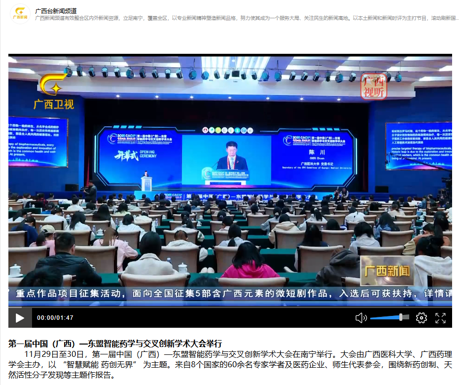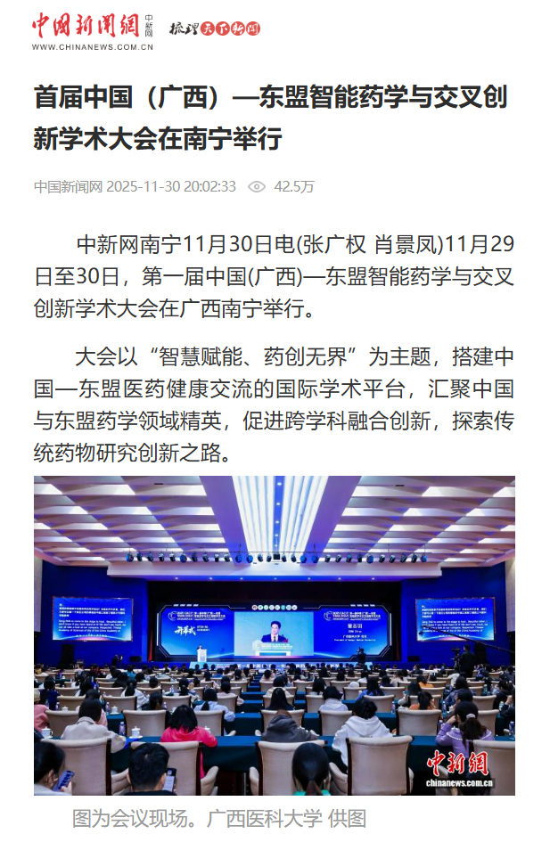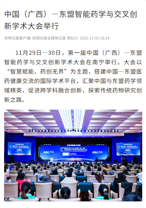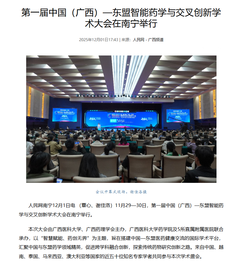 近日,人民网、光明日报、中国新闻网、广西日报、广西广播电视台报道第一届中国(广西)—东盟智能药学与交叉创新学术大会举行,本届大会由广西医科大学、广西药理学会主办,广西医科大学药学院及5所直属附属医院联合承办。大会以“智慧赋能、药创无界”为主题,搭建中国—东盟医药健康交流的国际学术平台,汇聚中国与东盟药学领域精英,促进跨学科融合创新,探索传统药物研究创新之路。