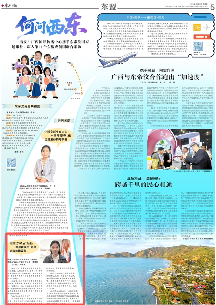 ■讲述人:东帝汶在桂留学生 冯美悦 整理:广西云-广西日报记者 黄君栋 实习生 刘原《 广西日报 》( 2025年12月19日第 005 版)今年10月,东帝汶正式成为东盟第11个成员国。也因这个契机,今年11月,刚高中毕业的我,在父亲的鼓励下,来到中国留学,目前是广西医科大学临床医学专业的一名大一新生。出发前,我对中国的印象大多来自社交媒体:发展迅速、风景秀丽、民族音乐动人。百闻不如一见。当我真正踏上这片土地,高速的社会发展让我倍感兴奋、便捷的智能生活让我倍感惊奇、热情的中国师生让我倍感亲切。“在广西,我学到什么?”我主动学习中文、了解中华文化——从第一次书写汉字、学说普通话,到了解中国的历史与发展成就,这些经历让我真切体会到,中国是现代化发展的成功范例。在这里,我结识了来自世界各地的朋友,我们一起享受广西美食,我也请他们品尝我们国家的猫屎咖啡。这里的老师专业又耐心,在他们的帮助下,我得以精进学业,学习此前从未接触过的专业知识。我爱上了广西。我希望未来能成为一名优秀的医生,将在中国学到的先进医学知识、技术乃至医院管理经验带回我的国家,切实提升东帝汶的医疗水平。我期待自己也能成为两国合作的桥梁之一,为日益深厚的友谊贡献一份力量。