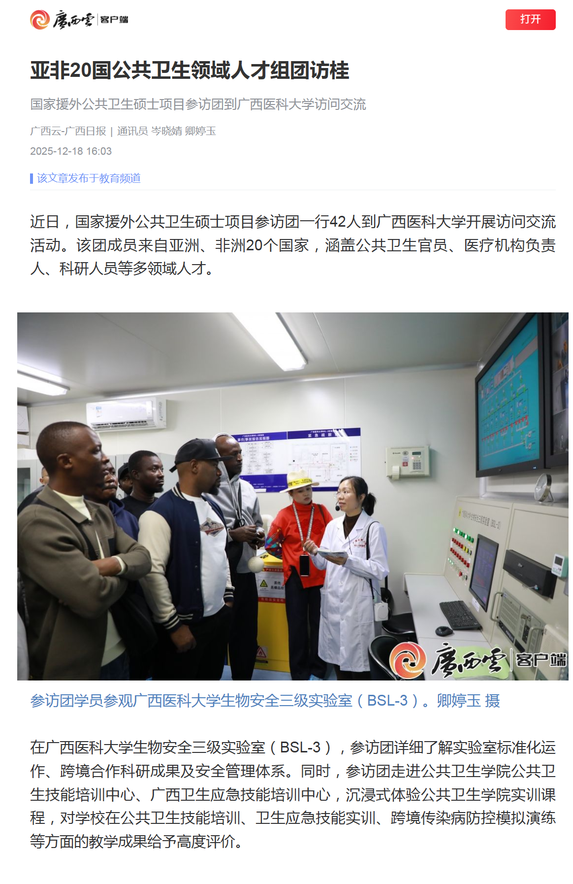 近日,广西云-广西日报报道了国家援外公共卫生硕士项目参访团到我校访问交流的相关情况,该参访团由亚非20国公共卫生领域多类人才组成,通过实地考察我校科研平台、实训中心及附属医院等,深入了解我校公共卫生教学科研、国际化人才培养及“人工智能+医疗健康”创新应用等成果,彰显了我校在推动“健康丝绸之路”建设、深化国际公共卫生合作中的积极作为。