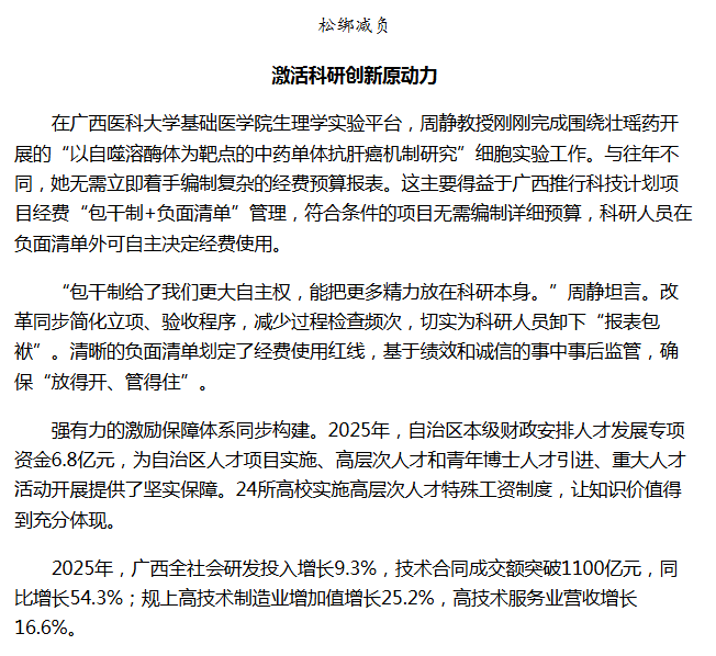 在广西医科大学基础医学院生理学实验平台,周静教授刚刚完成围绕壮瑶药开展的“以自噬溶酶体为靶点的中药单体抗肝癌机制研究”细胞实验工作。与往年不同,她无需立即着手编制复杂的经费预算报表。这主要得益于广西推行科技计划项目经费“包干制+负面清单”管理,符合条件的项目无需编制详细预算,科研人员在负面清单外可自主决定经费使用。