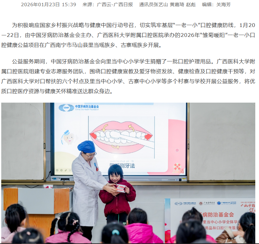 1月20—22日,由中国牙病防治基金会主办、我校附属口腔医院承办的2026年“雏菊暖阳”一老一小口腔健康公益项目在广西南宁市马山县里当瑶族乡、古寨瑶族乡开展。广西日报、南国早报对活动行了报道。以下是报道链接和报道详情: