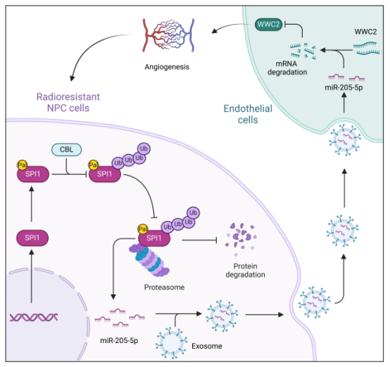 鼻咽癌(nasopharyngeal carcinoma, NPC)是我国华南地区高发的头颈部恶性肿瘤,放疗是其首选治疗手段,但部分患者出现的放疗抵抗严重削弱了治疗效果。研究团队发现,在放疗抵抗的鼻咽癌组织中,SPI1蛋白异常高表达,并通过调控miR-205-5p促进肿瘤血管异常生成,进而加剧放疗抵抗。进一步机制研究首次揭示了SPI1棕榈酰化修饰抑制其泛素化降解的分子机制,导致SPI1在细胞内稳定累积。更为重要的是,团队成功构建了携带miR-205-5p抑制剂的工程化外泌体,该递送系统可有效诱导肿瘤血管正常化,显著逆转鼻咽癌的放疗抵抗。该研究首次揭示了鼻咽癌放疗抵抗的新机制,并成功构建了一种工程化外泌体递送系统,为逆转放疗抵抗提供了全新的精准治疗策略。
